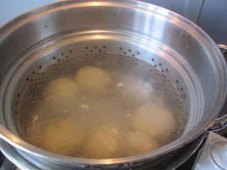 Se pun la fiert într-un vas cu apă clocotită, se fierb, la foc mic neacoperit, până când se ridica la suprafața.