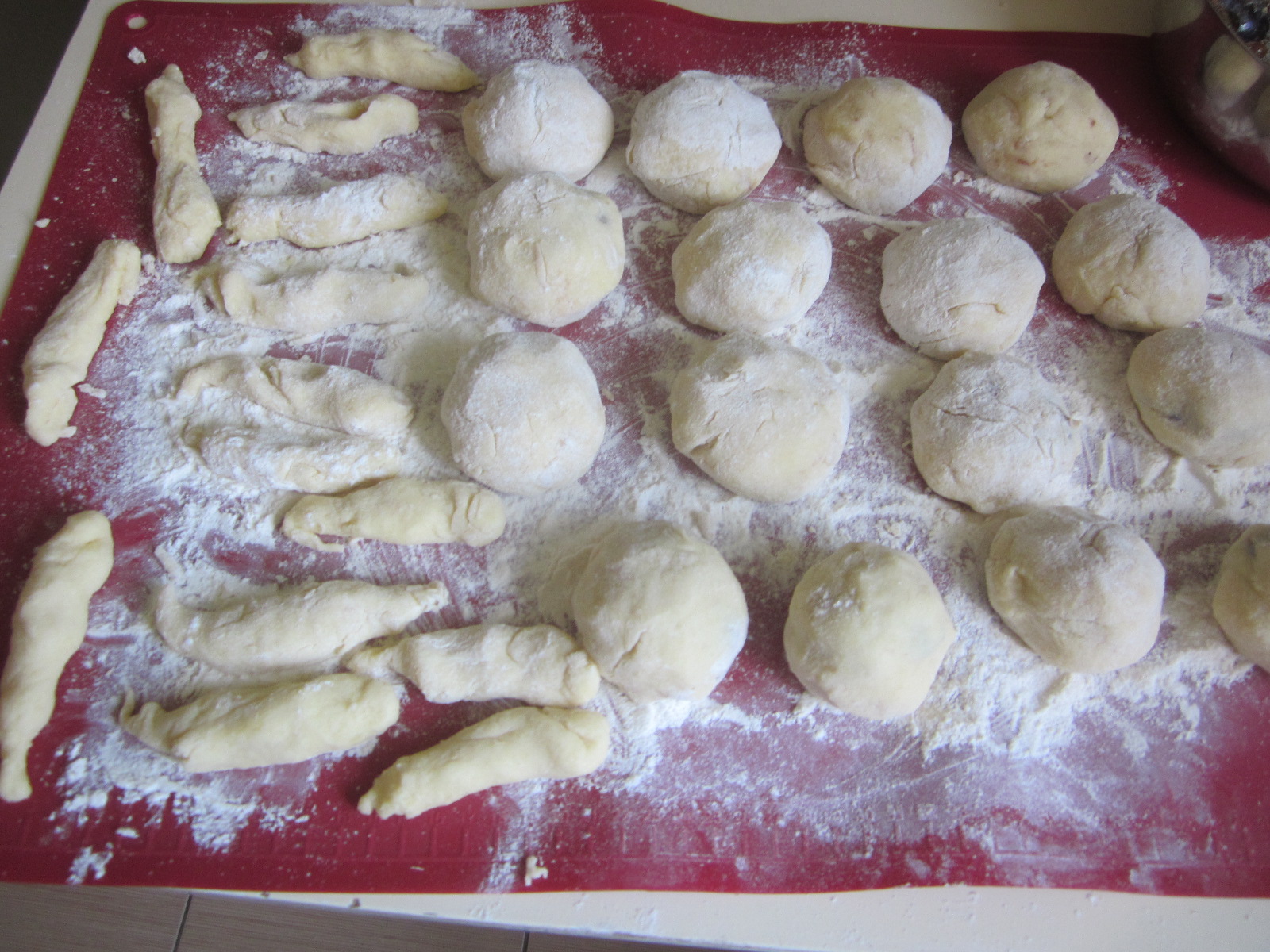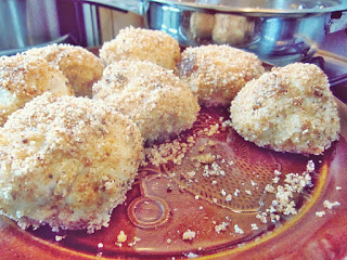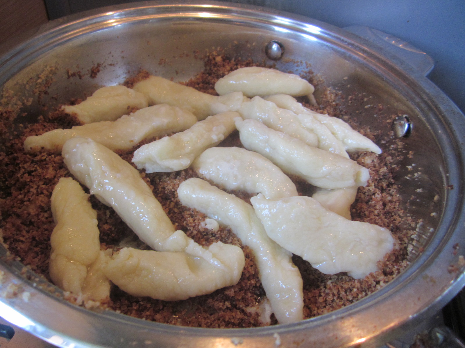 Găluștele se rostogolesc fierbinți, rapid prin pesmetul aurit și se scot pe un platou. Deobicei, păstrez aluat și formez ”puțișoare” de fapt sunt nudli, se ia o bucată mică de aluat și se rulează în palme, exact, ca si cornulețe, apoi se pun la fiert la fel ca și găluștele, se rulează prin pesmet.