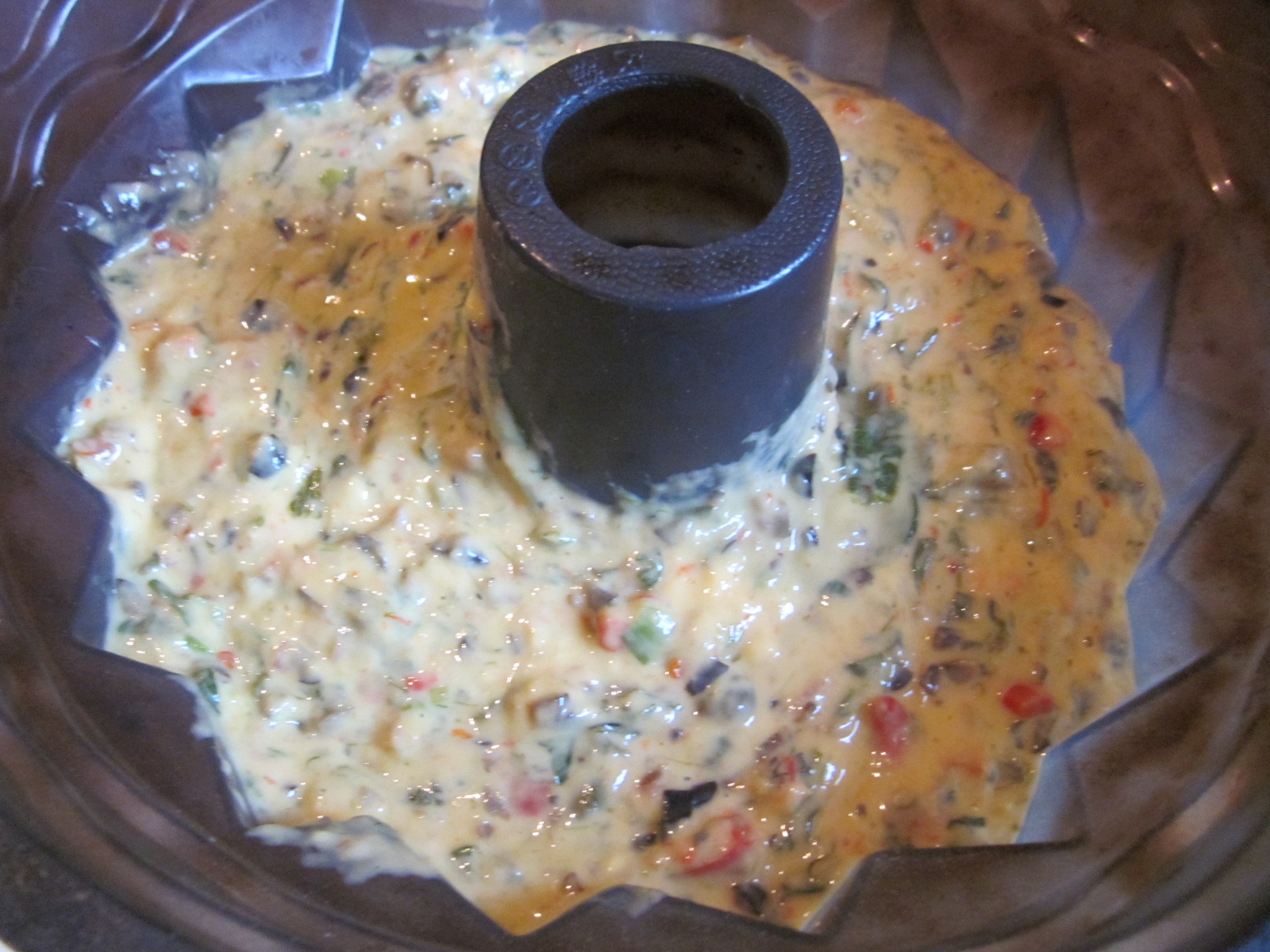 - Prazul și ardeiul se curăță, se taie rondele și se pun la călit în puțin ulei de măsline, asezonat cu sare și piper proaspăt măcinat, neacoperit, la foc iute cca. 5 minute, amestecându-se ca să nu se ardă. Apoi se adaugă ciupercile tocate mărunt și pipetu de pui tocat/măcinat mărunt, lăsându-se la gătit încă 5 minute la foc mediu, neacoperit.