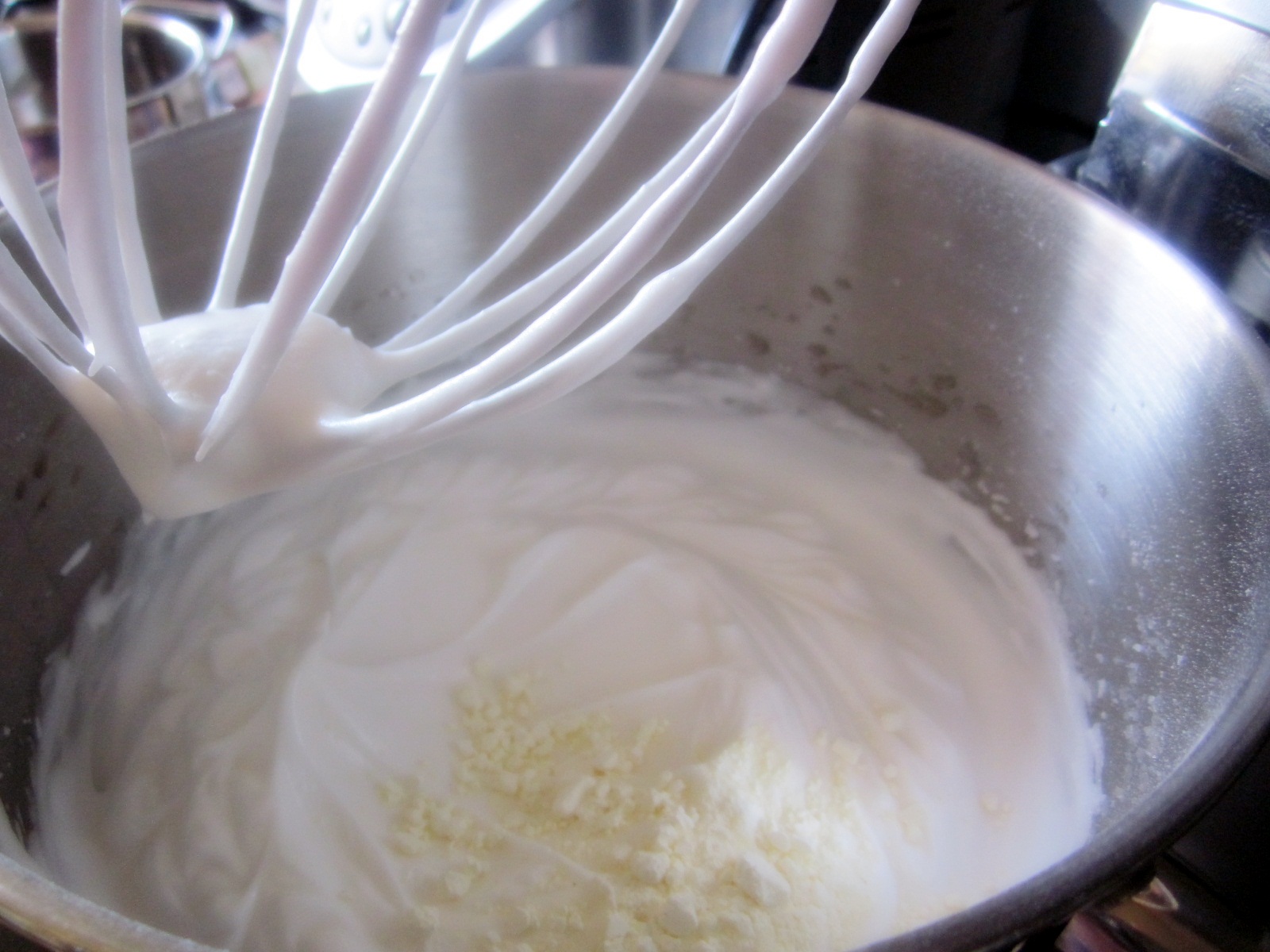 - Albușurile, la temperatura camerei, se bat energic în prima fază cu un praf de sare și 1 linguriță de oțet. După ce au devenit o spumă consistentă, se adaugă zahărul, zahărul vanlinat și se continuă baterea. Pentru această etapă l-am folosit de Thor 😀 robotul semiprofesional;) alt ajutor de nădeje din bucătăria Zmeilor. După ce s-a topit zahărul se adaugă praful de copt și făina cernută, apoi se amestecă ușor cu o paletă, ca să se încorporeze toată făina. Pudra de cacao se presară peste aluatul obținut și se amestecă circular, foarte, foarte fin, ca să aibe aspectul. Se toarnă aluatul obținut într-o formă de guguluf, unsă cu puțină grăsime, apoi se preasară stafidele și lămâia confiată, apăsându-se ușor, cât să fie incorporate în compozițe.