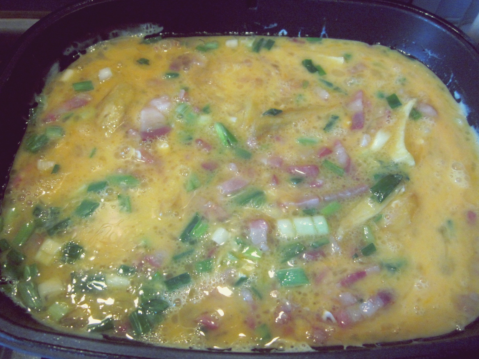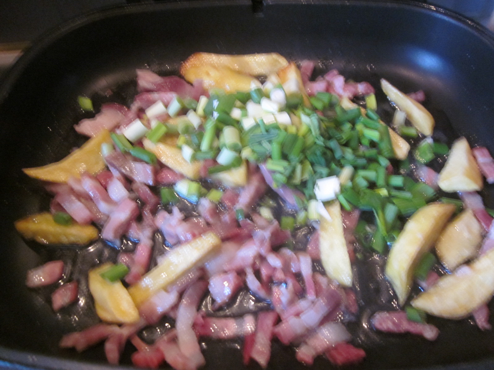- Intr-o tigaie, eu folosesc Doubleta, se pun cca, 2 linguri de ulei la încins. Se adaugă cartofii ”resturile” de cartofi prăjiți, de vineri :d, [noi, vinerea avem zi de cartofi prăjiți, Asta pentru că gătesc Zmeișorii ;), cu diverse adaosuriJ (cârnați, ceafă, cotlet, pui)], mereu prepar mai mulți, ca să rămână ptr omleta bogată de sâmbătă;), baconul cubulețe și ceapa verde tăiată mărunt, lăsându-se la gătit, acoperit cca. 3-4 minute.