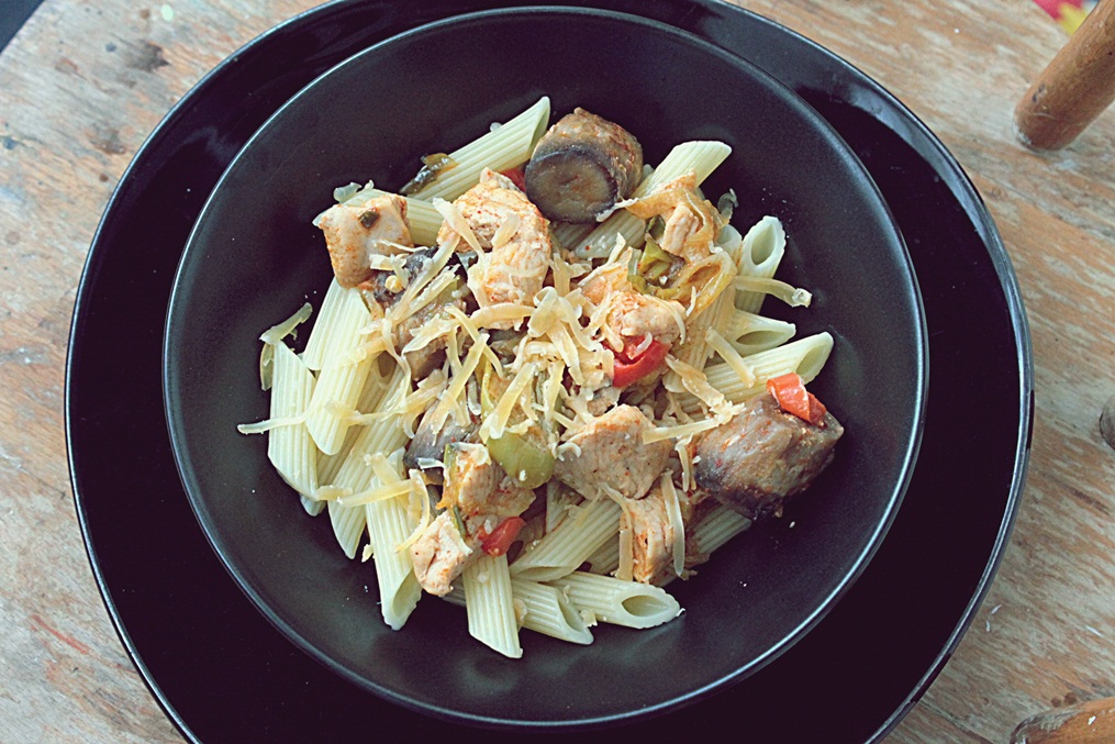 - Vă asigur că e foarte savuroasă mâncărica, iar fiecare ingredient și-a păstrat propia aromă;) Spor și poftă bună! P.S. Alături am fiert paste pene;) Iar ca topping, am ras brânză Gouda maturată 😉
