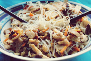 - După ce se s-au gătit legumele și carnea, se pun în alt vas, amestecându-se pentru a se îngloba bine toate ingredientele și se lasă la foc mic, până se adaugă tăițeii sticloși.