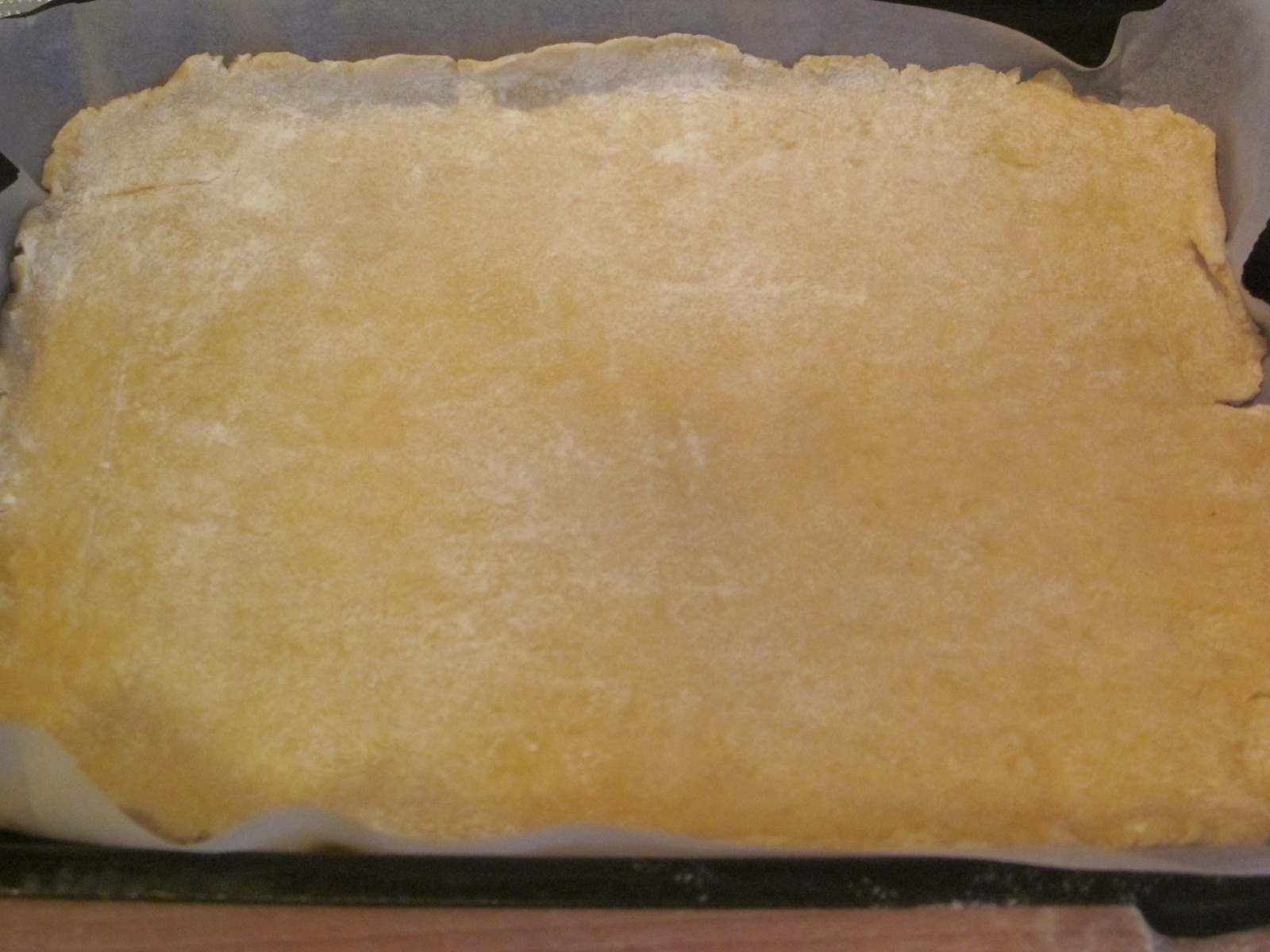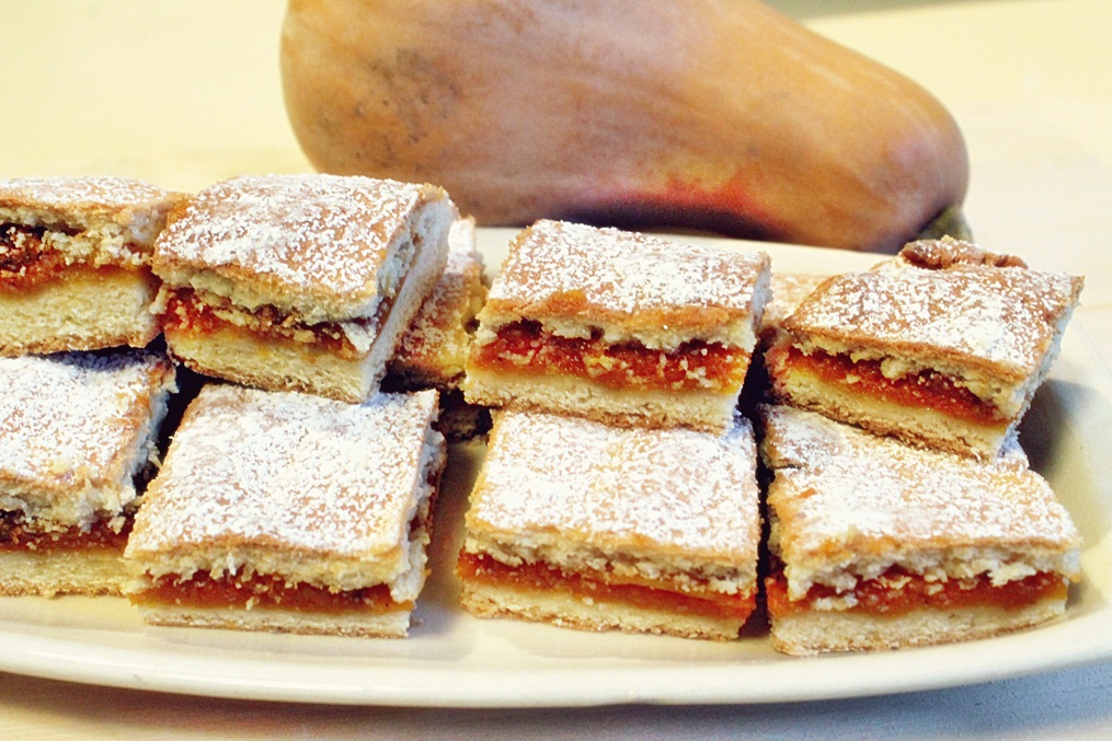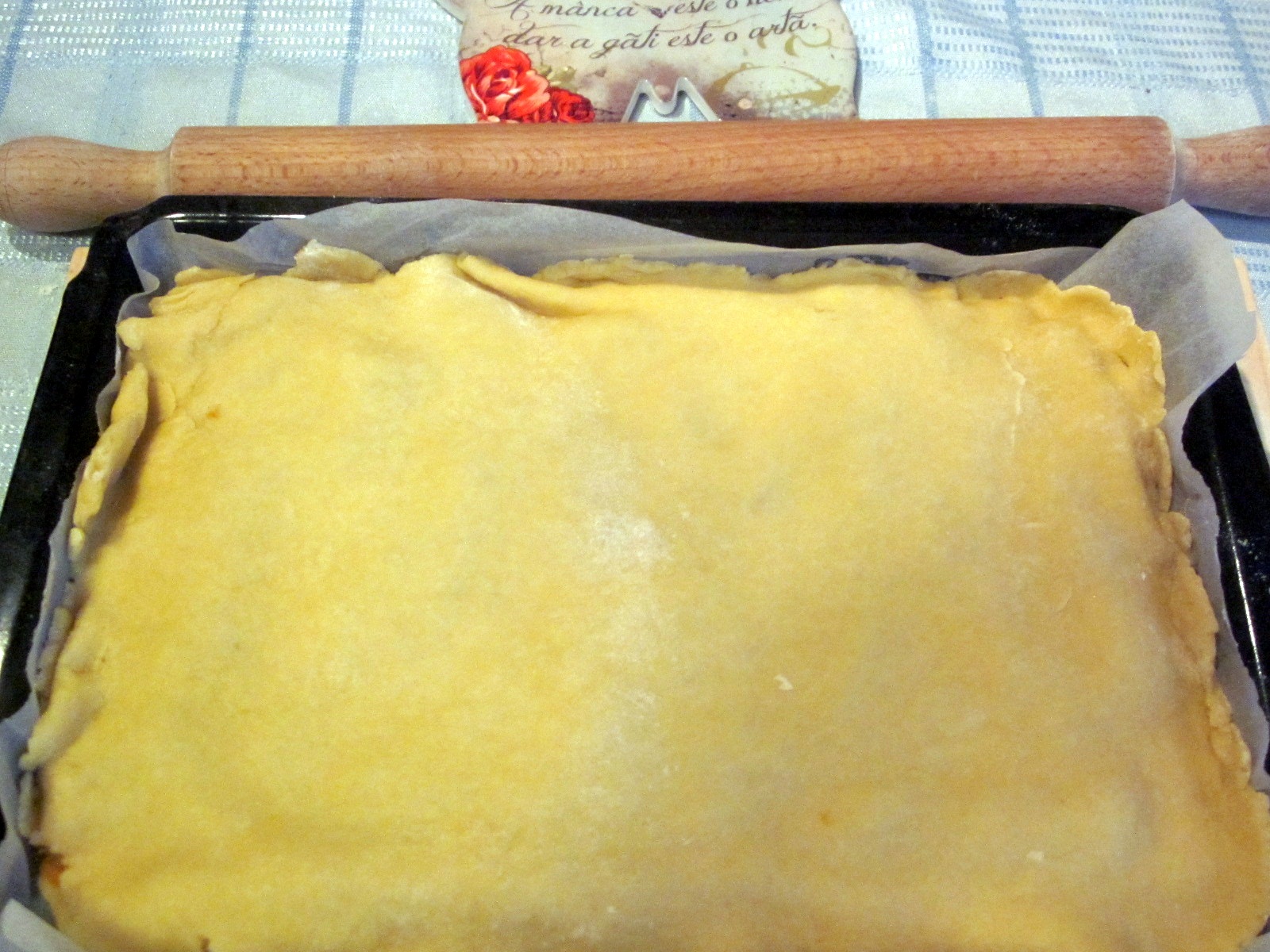 •  Dovleacul ras, se amestecă cu zahărul, zahărul vamilinat aromat, scorțișoara și zeama de lămâie, apoi se pune la călit, la foc mic, într-un vas cu fundul gros, chiar ceaun, cca. 15 minute, până se înmoaie și se evaporă zeama lăsată.  Se scoate aluatul de la rece, se împarte în două, se întinde o foaie care se așează într-o tavă tapetata cu cu foaie de pergament. Se așează umplutura de dovleac aromat, se acoperă cu a doua foaie, care se înțeapă din loc în loc cu furculița și se presară.