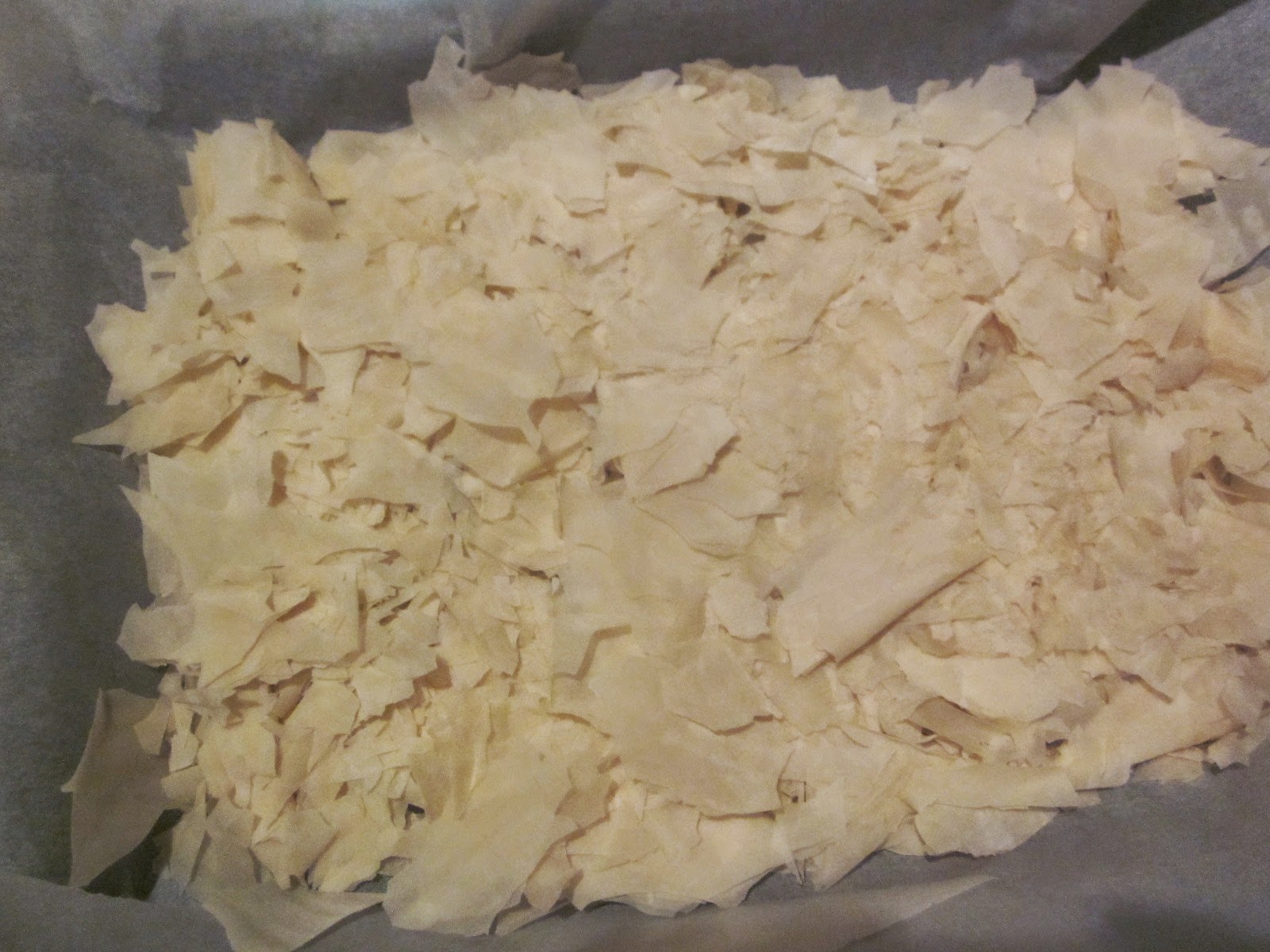 Foile de plăcintă dezghețate, se lasă la uscat vreo cîteva ore chiar și mai multe zile,acoperite cu un șervet de bucătărie. După ce s-au uscat bine se fărâmițează cât se poate lucra cu ele.