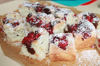 Într-o tavă tapetată se toarnă compoziția albă, apoi cea cu pudra de cacao din loc în loc, deasupra se adaugă zmeura proaspătă.
