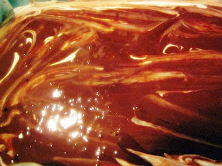 • În cel de-al doilea bol se adaugă pudra de cacao, se amestecă, deasemenea ușor, apoi compoziția obținută se toarnă ușor peste cea cu mac, începând de la un capăt la altul, astfel încât să acoperiți toată compoziția deschisă la culoare.