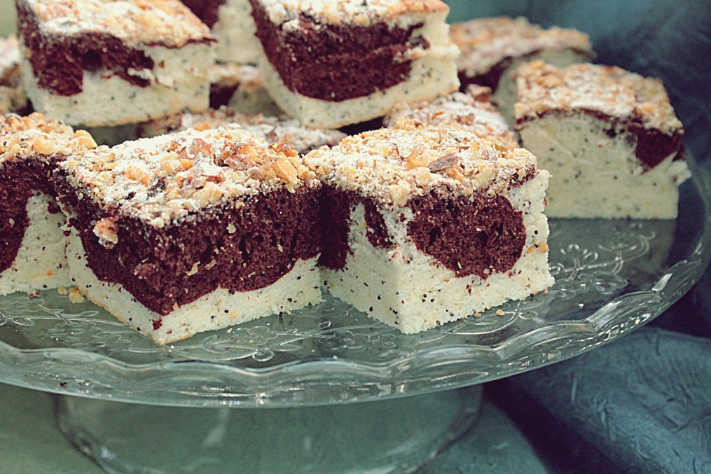 Prăjitură din albușuri, mac, cacao și nucă