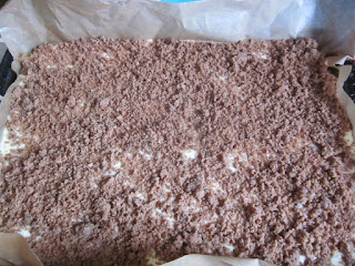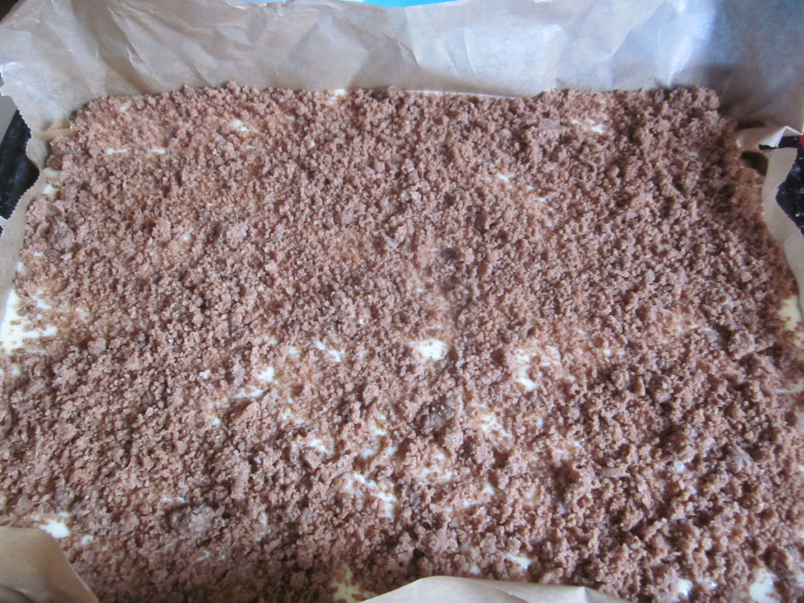 - În tava tapetată cu foaie de pergament, se presară un strat de firimituri uniform, cât să se creeze o bază 😉