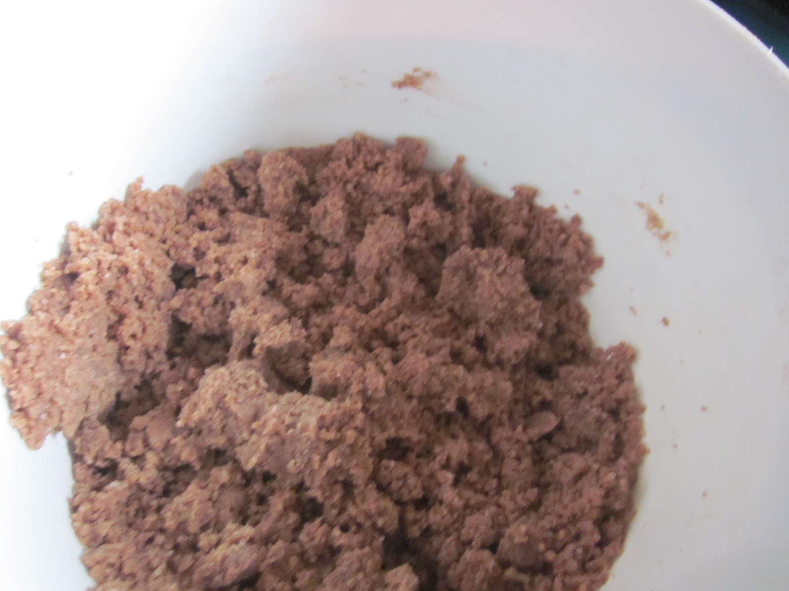 - Untul se topește la microunde cca. 60 de secunde, apoi se adaugă făina, un praf de sare iodată, praful de copt, zahărul, pudra de cacao șu gălbenușul de ou, se frământă bine, până ce se obține un aluat sfărâmicios, adică firimituri.