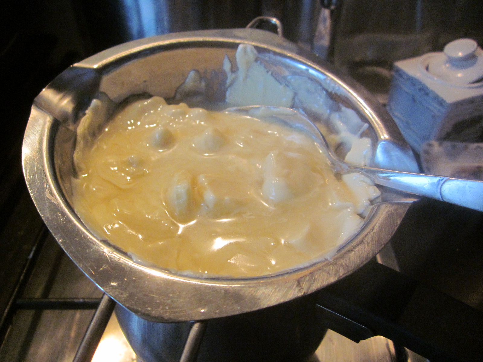 - Crema de caramel se lasă la răcit, apoi se toarnă peste glazura de ciocolată albă. Atenție! Ambele compoziții trebuie să fie reci, altfel se întrepătrund.
