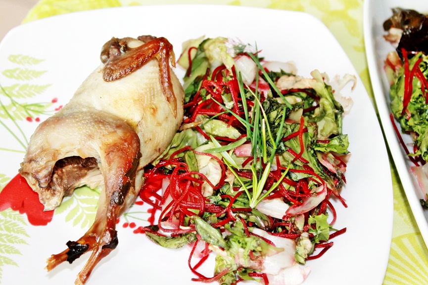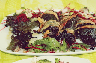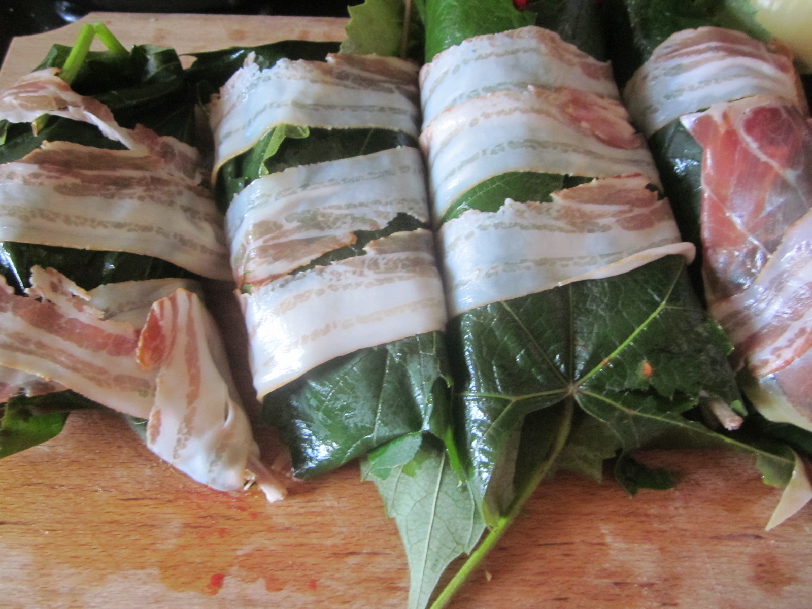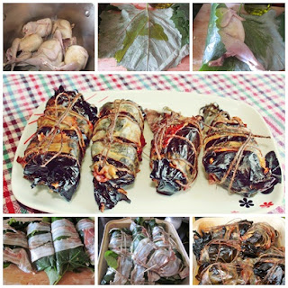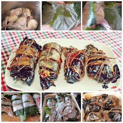 - Frunzele de viță se suprapun câte două, în așa fel încât să se poată înveli prepelița, apoi se ung cu puțin ulei de măsline, se așează înaripata și se închide ca și o sarma uriașă.