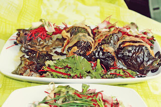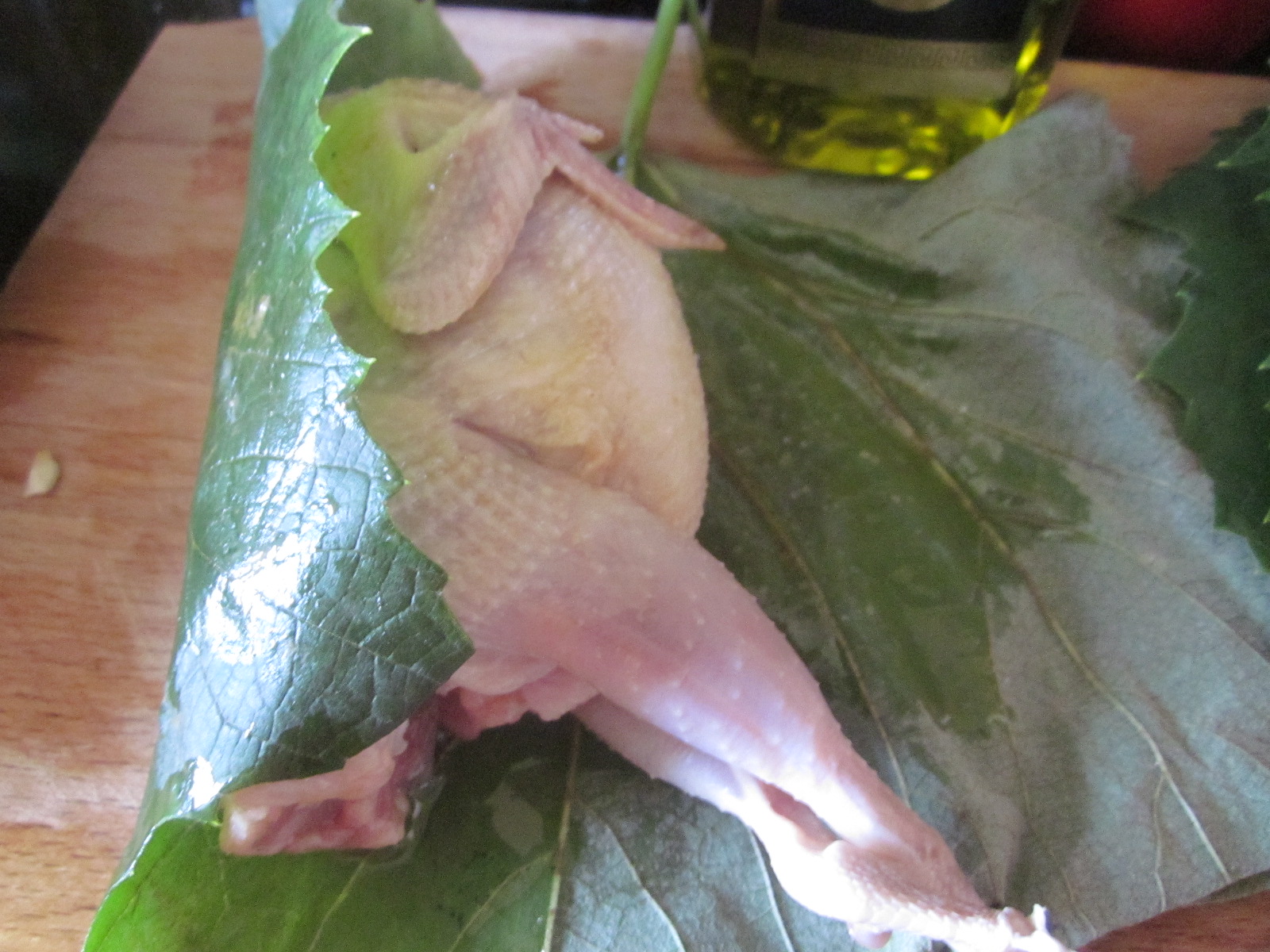 • Frunzele de viță se suprapun câte două, în așa fel încât să se poată înveli prepelița, apoi se ung cu puțin ulei de măsline, se așează înaripata și se închide ca și o sarma uriașă.