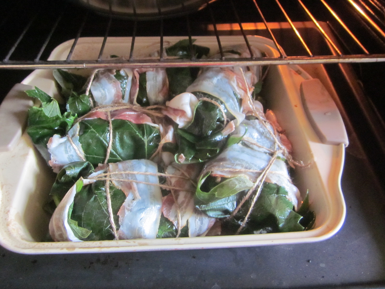 •  Pachețele se sigilează cu felii subțiri de bacon, sau slănină afumată din dotare, apoi se leagă strâns cu ață de bucătărie.