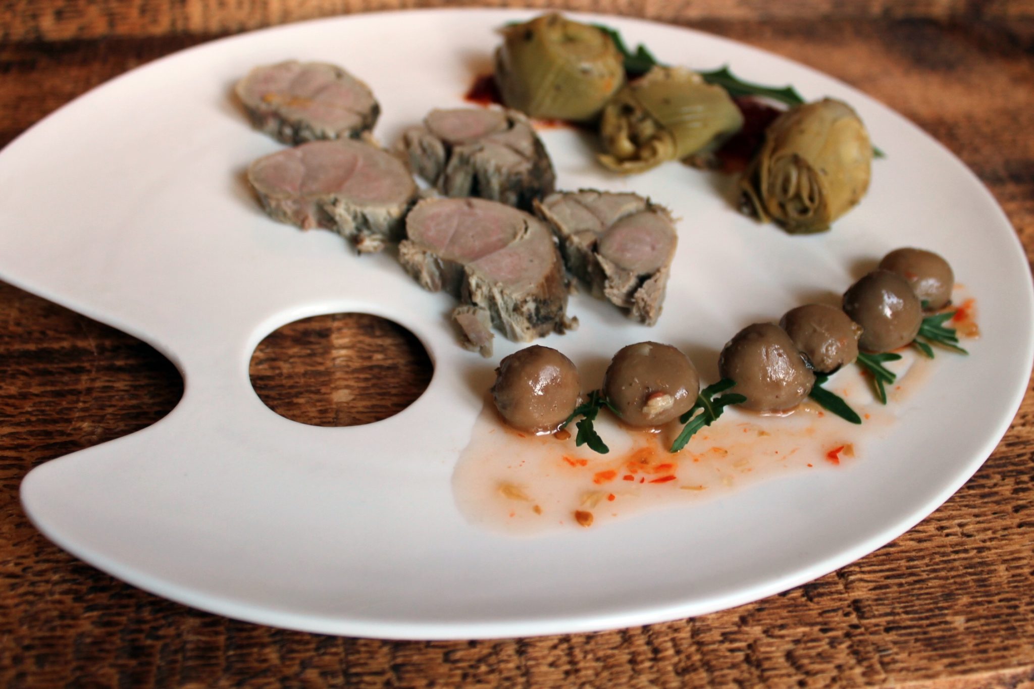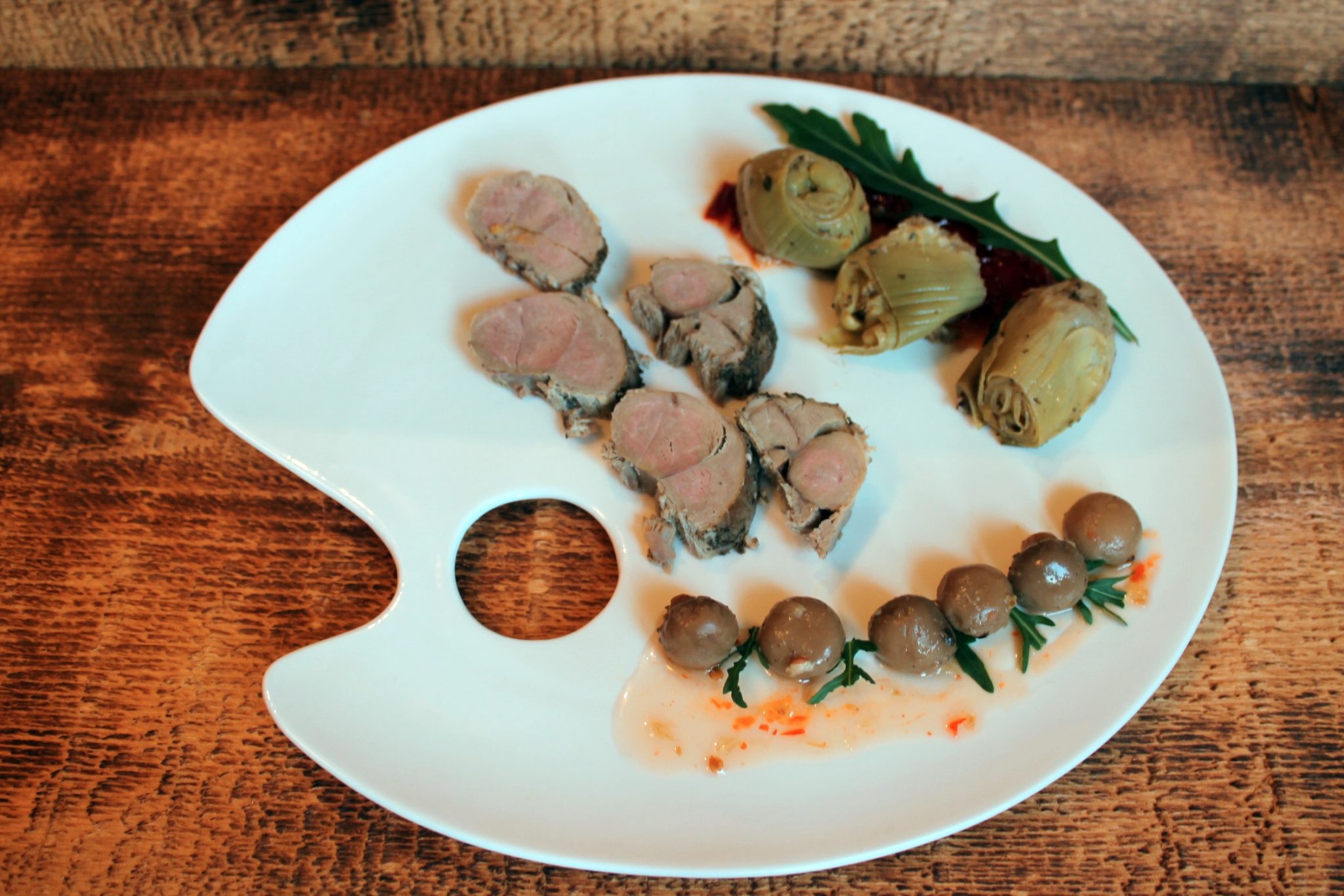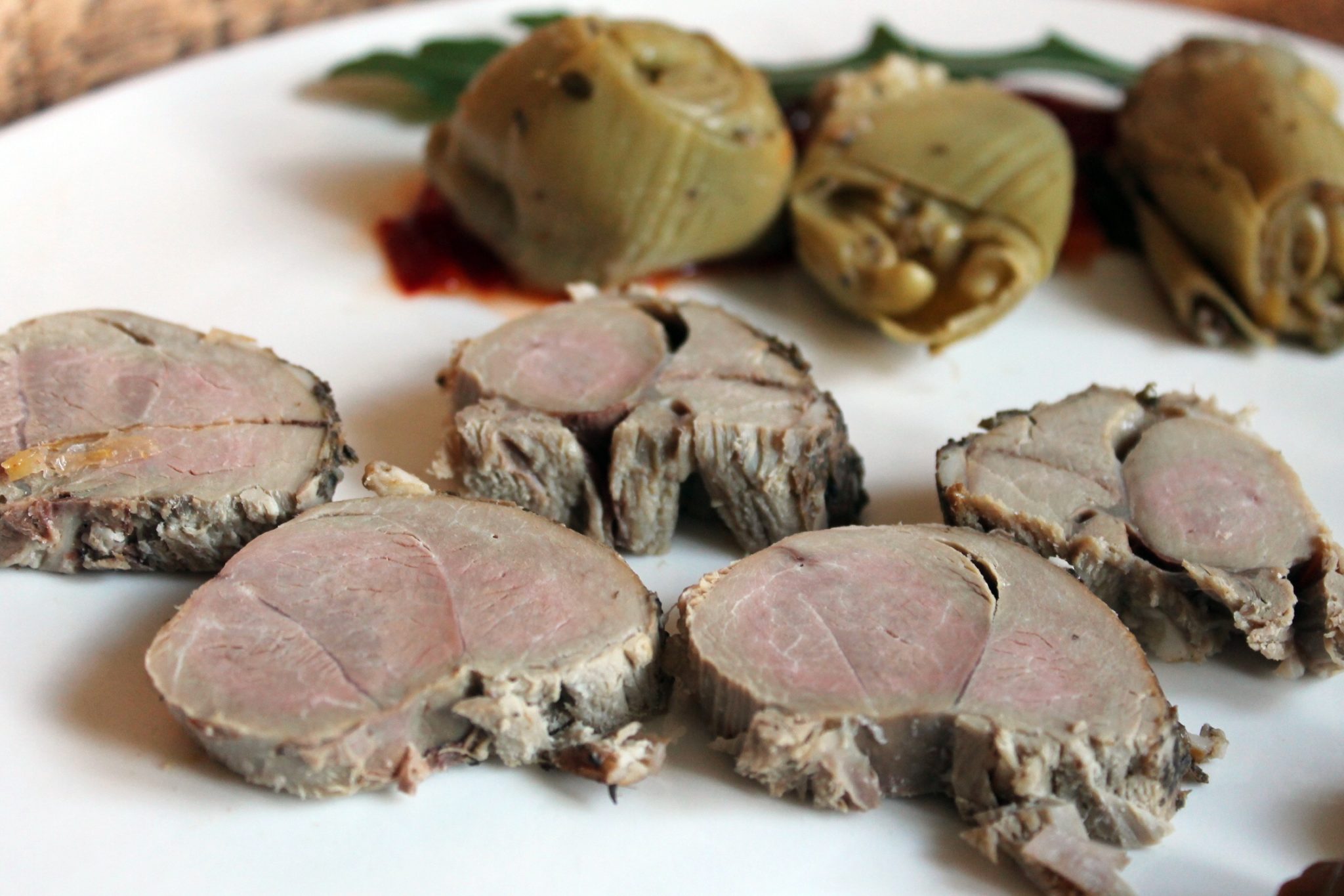 - Lămâia se spală și apoi se feliază, roșiile cherry se spală și se taie în două, miezul de anginare se scoate din conservă, se scurge de lichid, apoi se adaugă artistic, toate cele de mai sus în tava cu pulpa de miel și vegetale.