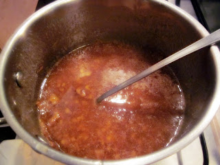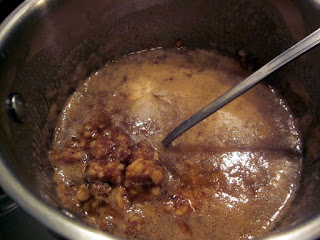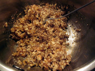 - După ce zahărul topit a prins culoarea caramelului, se ia de pe foc, se adaugă nucile tocate și se amestecă până ce se înglobează în zahărul caramel.