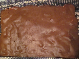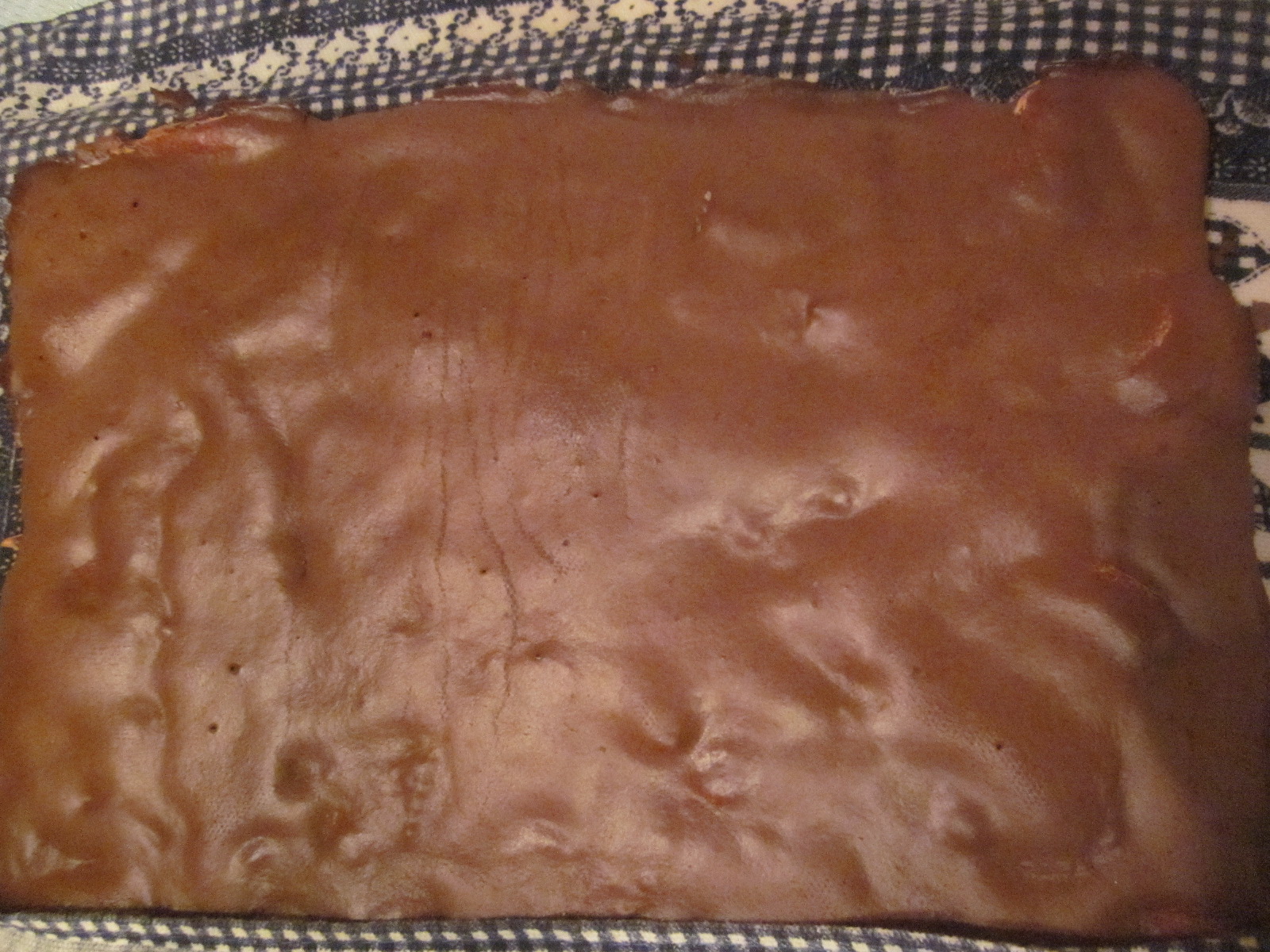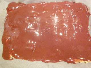 - În compoziția rămasă se adaugă pudra de cacao, apoi amestecă ușor până ce se obține un aluat colorat uniform, apoi aluatul de cacao se toarnă peste formele coapte, se nivelează și se pune la copt în cuptorul preîncins cca. 15 minute la 230 grade.
