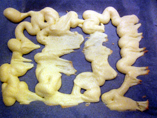 - Într-o tavă tapetată cu foaie de pergament se toarnă cu ajutorul unui poș sau linguri diverse forme, apoi se dă la copt în cuptorul preîncins cca. 5 minute.