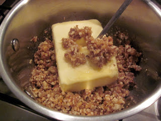 - Se adaugă untul și se pune din nou la foc mic, ca să se înglobeze bine untul, la final se adaugă gălbenușurile amestecate cu zahărul, fierbându-se la foc mic, până se îngroașe crema.