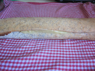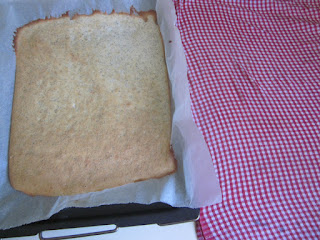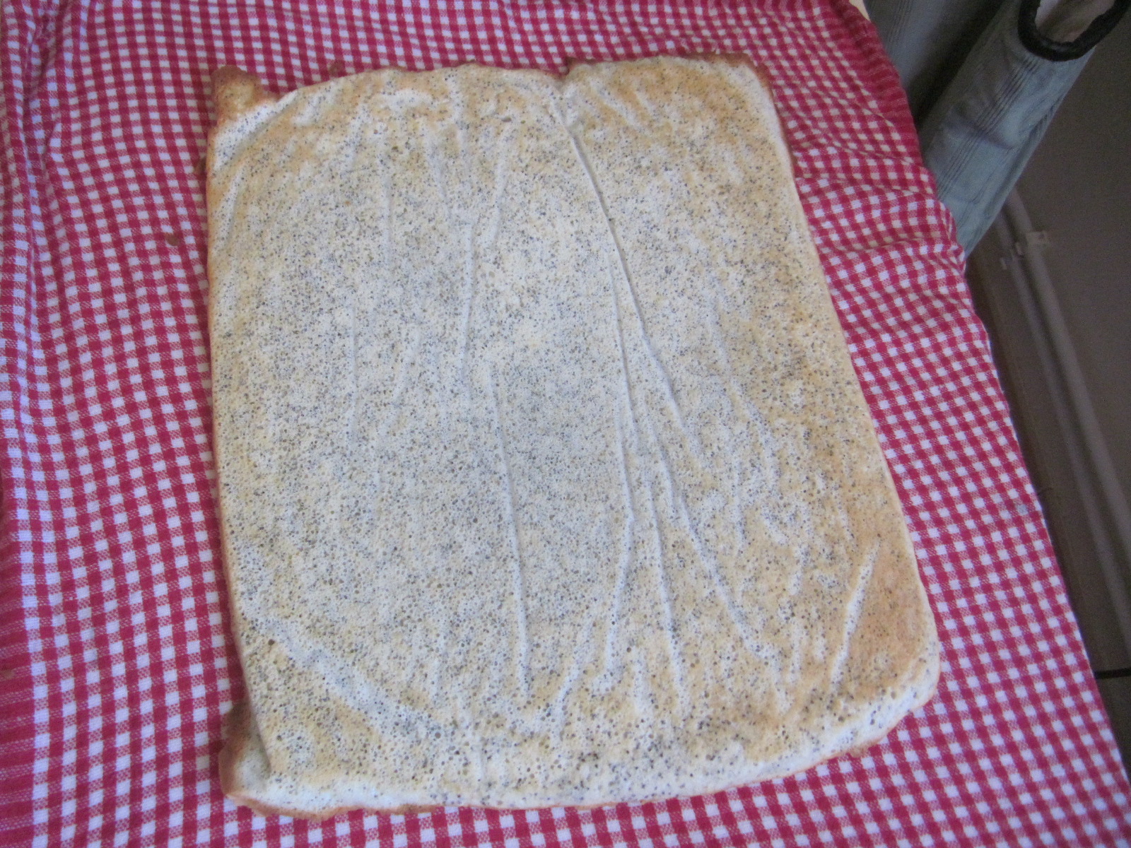 • Într-o tavă tapetată cu foaie de pergament și unsă cu puțină grăsime, se toarnă compoziția de mai sus, se nivelează și se pune la copt în cuptorul preîncins cca. 10 minute la 230 grade. După ce s-a copt, se scoate rulada pe un prosop de bucătărie umezit, se scoate ușor foaia de pregament, apoi se rulează fierbinte cu ajutorul prosopului umezit. Se lasă la răcorit cca. 20 de minute.