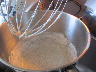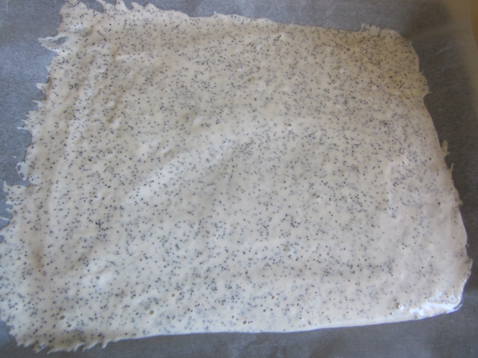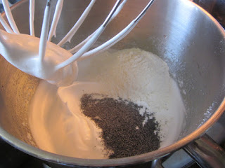 • Albușurile se mixează energic cu un praf de sare și oțetul de căpșuni. Apoi se adaugă zahărul tos și zahărul vanilinat, amestecându-se energic până ce se obține o bezea fermă. Apoi se adaugă făina, praful de copt, semințele de mac și esențele, amestecându-se ușor, până ce se înglobează toate ingredientele.