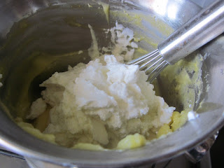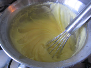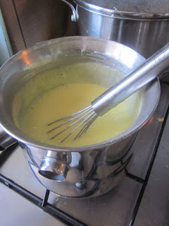• Între timp se prepară crema de lămâie: Gălbenușurile de ou se amestecă energic cu 5 linguir de zahăr, un plic de zahăr vanilinat, laptele și amidonul la bain Marie, sau într-un vas special de fiert laptele în cazul meu, la foc mic, până ce se omogenizează și se obține o cremă fină.