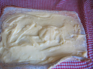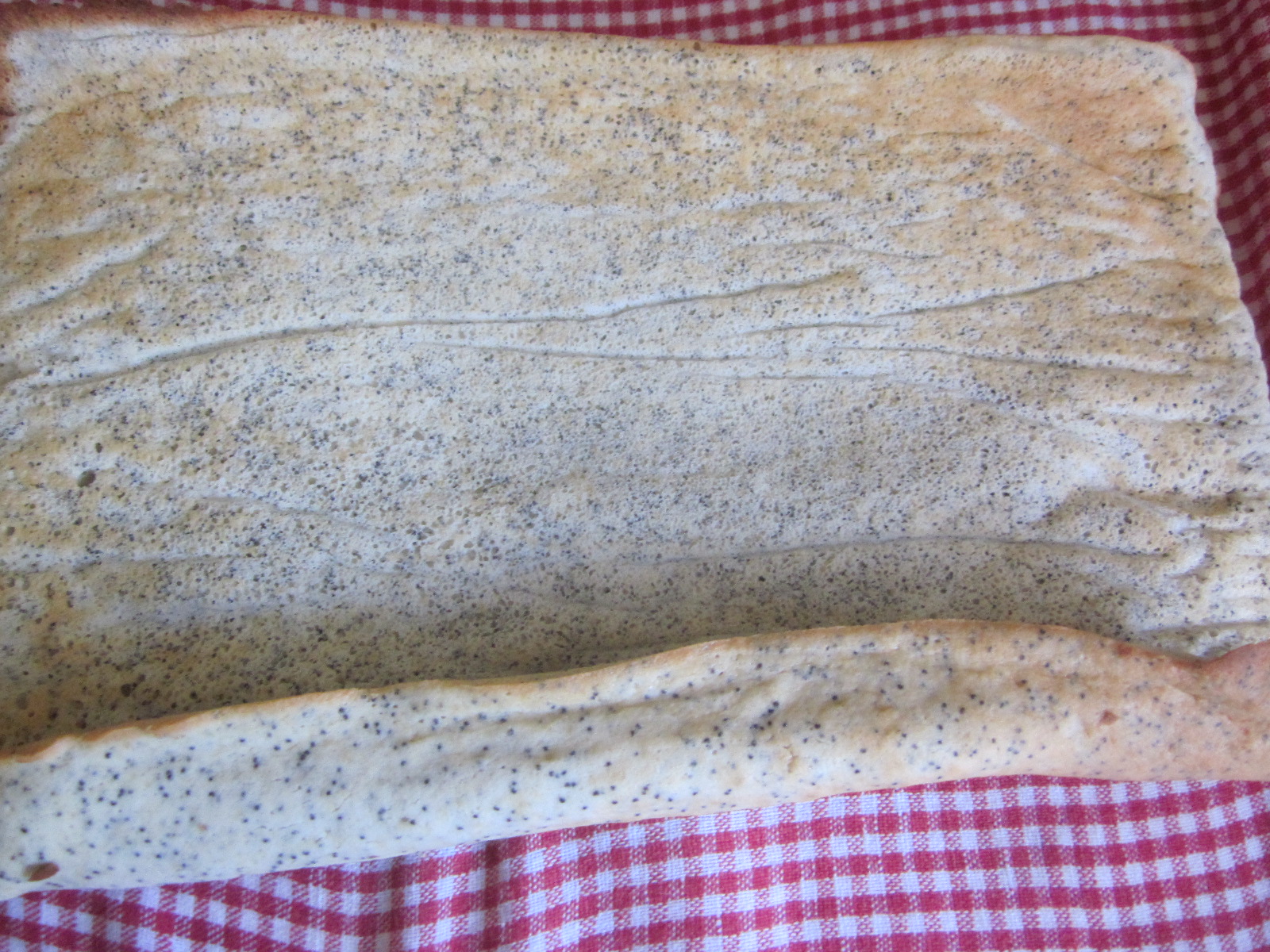 - Într-o tavă tapetată cu foaie de pergament și unsă cu puțină grăsime, se toarnă compoziția de mai sus, se nivelează și se pune la copt în cuptorul preîncins cca. 10 minute la 230 grade. După ce s-a copt, se scoate rulada pe un prosop de bucătărie umezit, se scoate ușor foaia de pregament, apoi se rulează fierbinte cu ajutorul prosopului umezit. Se lasă la răcorit cca. 20 de minute.