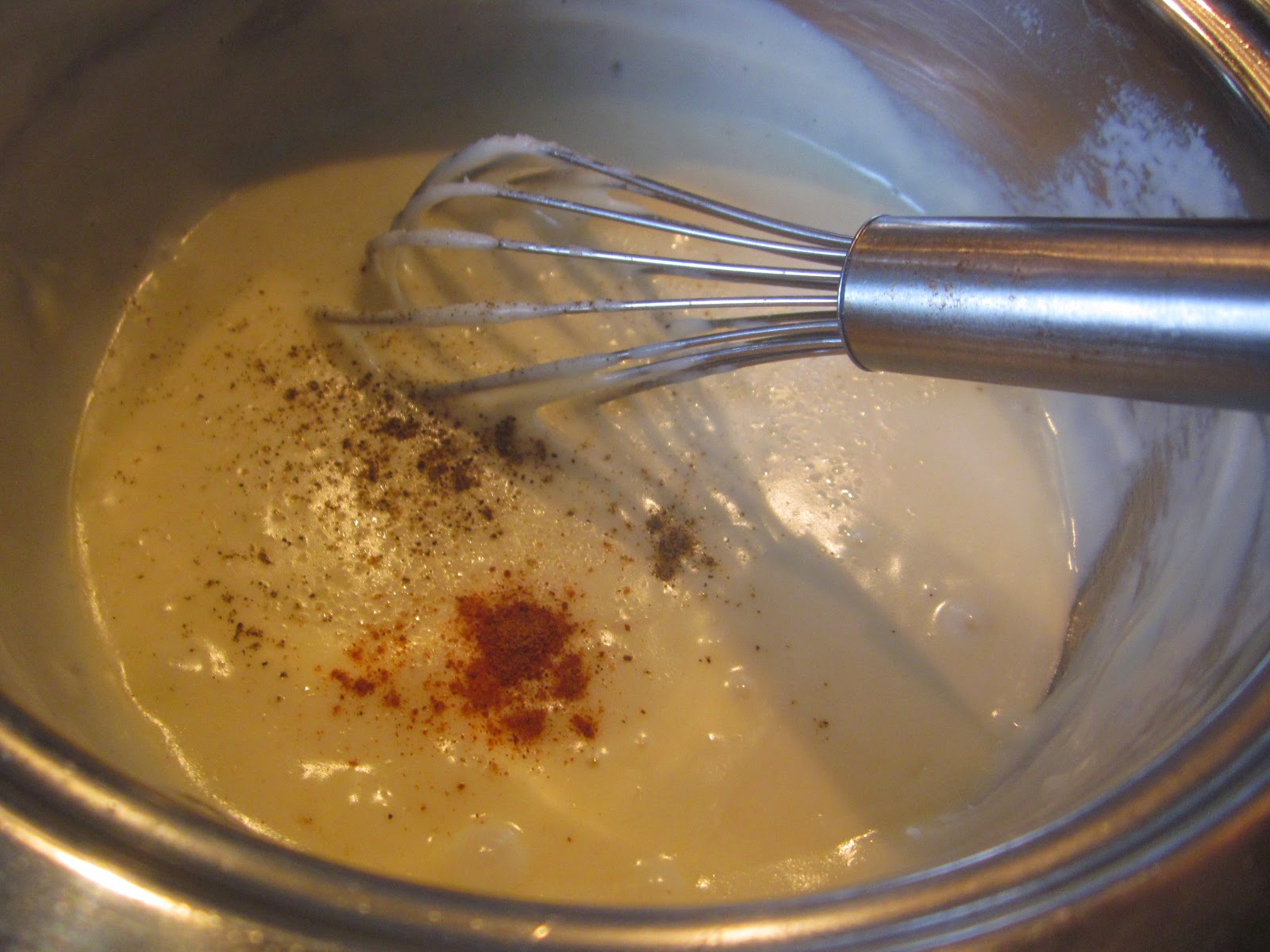 - Se pune din nou la gătit sosul amestecându-se continuu să nu facă cocoloașe, după ce a început să aibă consistența unei smântâni mai groase se adaugă cașcavalul ras pe răzătoarea mare și se amestecă până ce se topește și se va obține un sos omogen, la final se asezonează de sare, piper și nucșoară rasă.