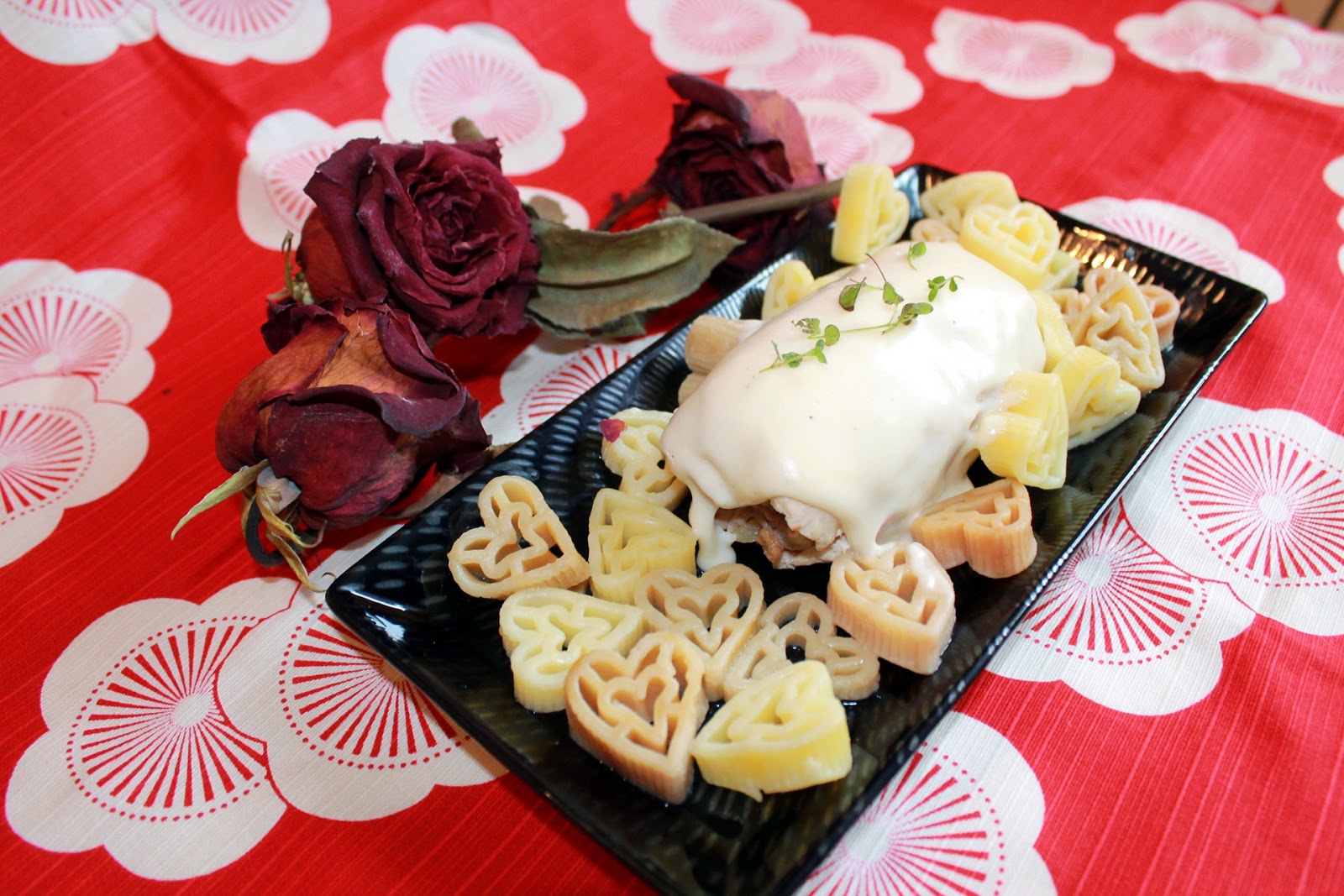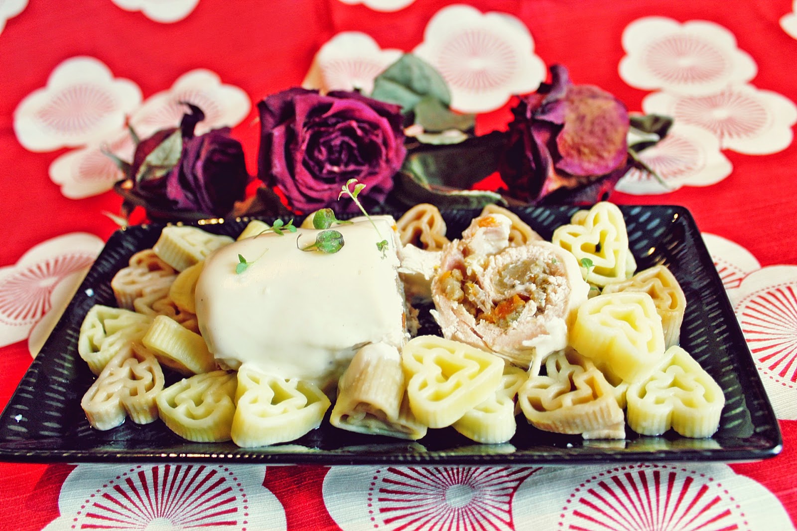 - Zilele trecuta am văzut la Liana, mai bine zis pe blog-ul ei http://pemasadinbucatarie.blogspot.ro/2012/10/rulada-de-pui-cu-sos-de-cascaval-si.html, o minunată ruladă de pui, cu un sos catifelat de cașcaval și paste colorate în formă de inimioare. M-a bântuit, rețeta, astfel că am tecut la fapte. Mai ales că am găsit și paste în formă de inimioară, nu mai aveam nicio scuză.
