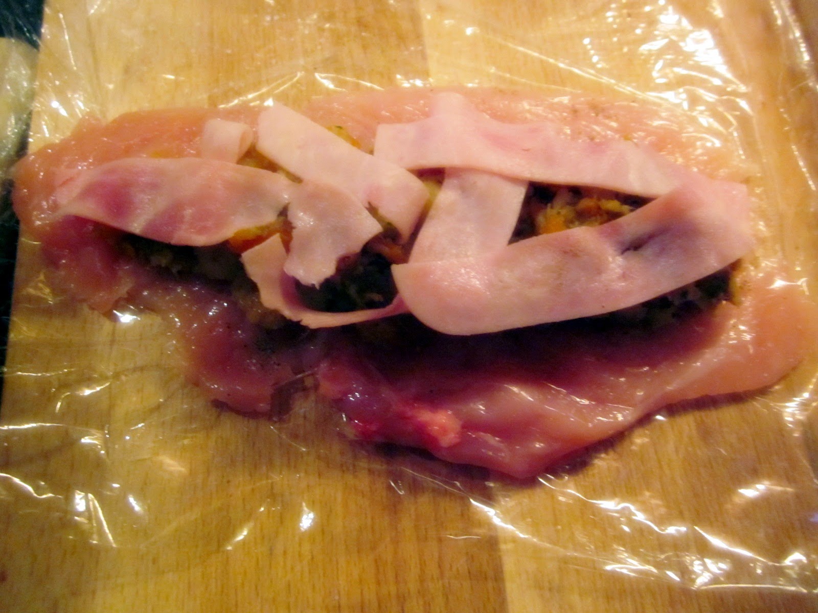 - Legumele fierte se pasează grosier. Pe o folie de aluminiu se așează feliile din piept de pui, ușor suprapuse, ca nu cumva să se scurgă umplutura în timpul coacerii, se așează umplutura de legume, felii de șuncă presată și se rulează ușor fileul de pui, cu ajutorul foliei. Apoi se pune la copt înt-unvas termorezistent, se adaugă ½ cană și se dă la copt în cuptorul preîncins cca 20 de minute la 250, întorcându-se din când în când ca să se coacă pe ambele părți.