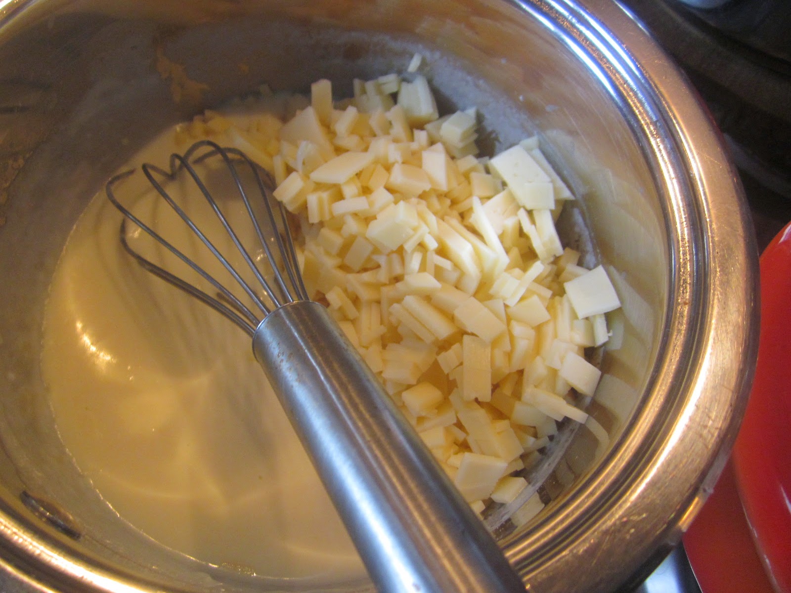 - Între timp se pregătește sosul de cașcaval. Într-o tigaie pentru sosuri cu fund triplu, se pune unutul la topit la foc mic, după ce s-a topit, atenție trebuie să rămână alb la culoare, se ia de pe foc se adaugă făina amestecându-se energic cu telul, ca să se omogenizeze și se adaugă treptat laptele, amestecându-se continuu ca să se înglobeze toate ingredientele.