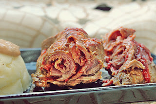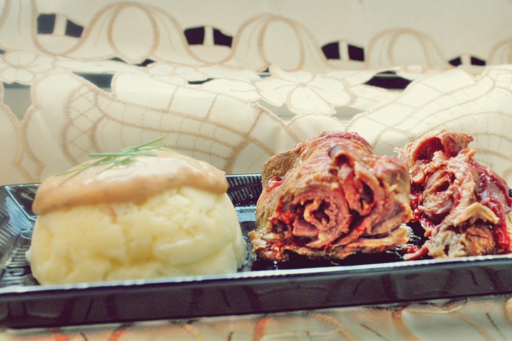 - Rulorile se servesc fierbinți acompaniate de piure din cartofi și sos de ciuperci, în cazul nostru, dar deobicei cu varză roșie călită și găluște din cartofi, nemțești 😉 Spor și poftă bună!
