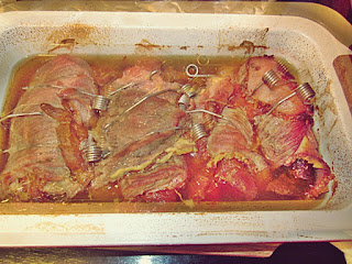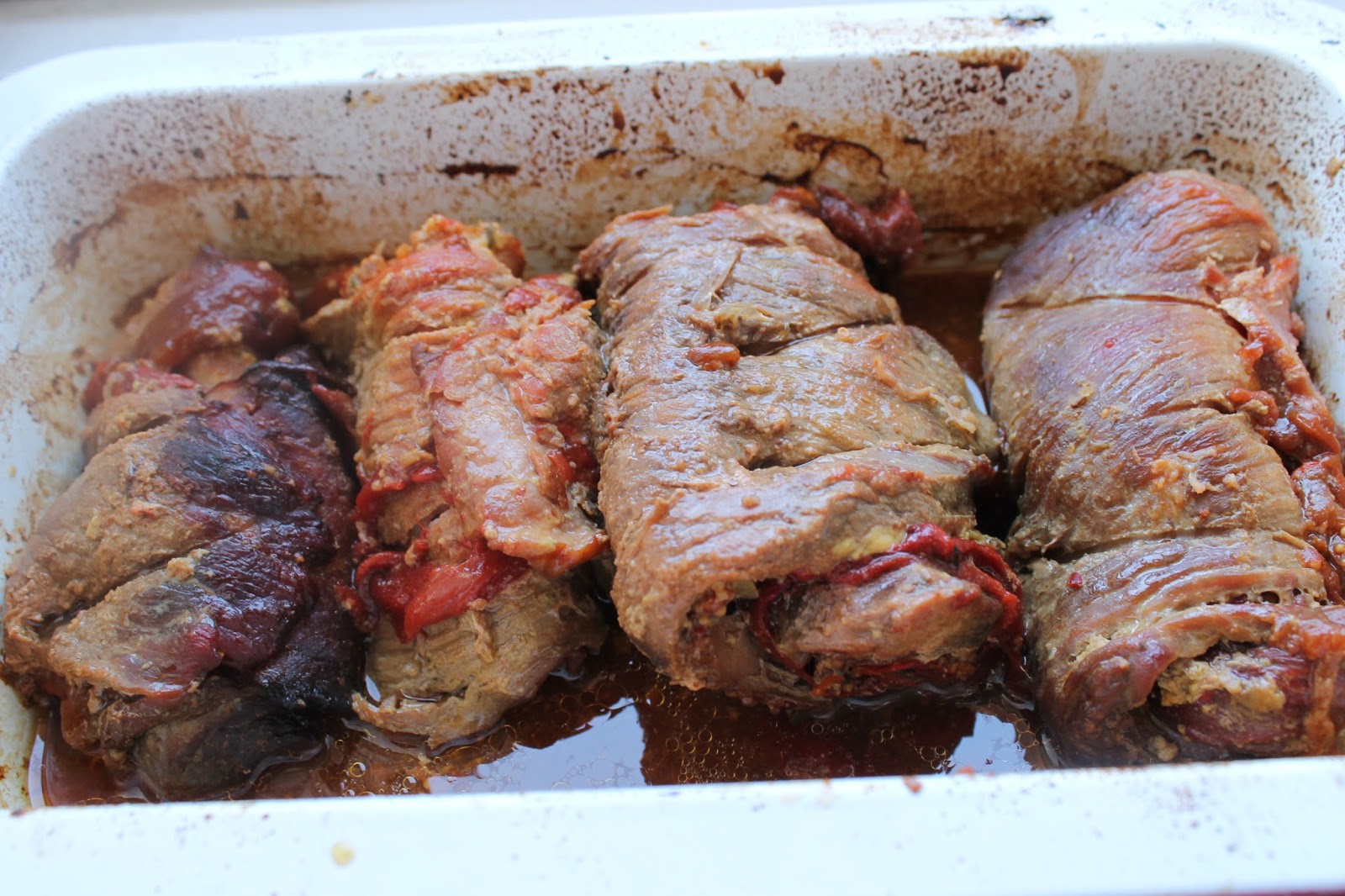 • Rulorile obținute se așează într-un vas termorezsitent, se stropesc cu puțin ulei de măsline, apoi se dau la cuptor ptr cca. 10 minute pe fiecare parte, apoi se toarnă vinul, se acoperă cu un capac, sau folie de aluminiu și se lasă la gătit cca. 90 de minute la foc mediu, 180 grade, electric.