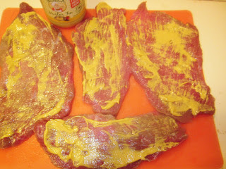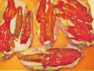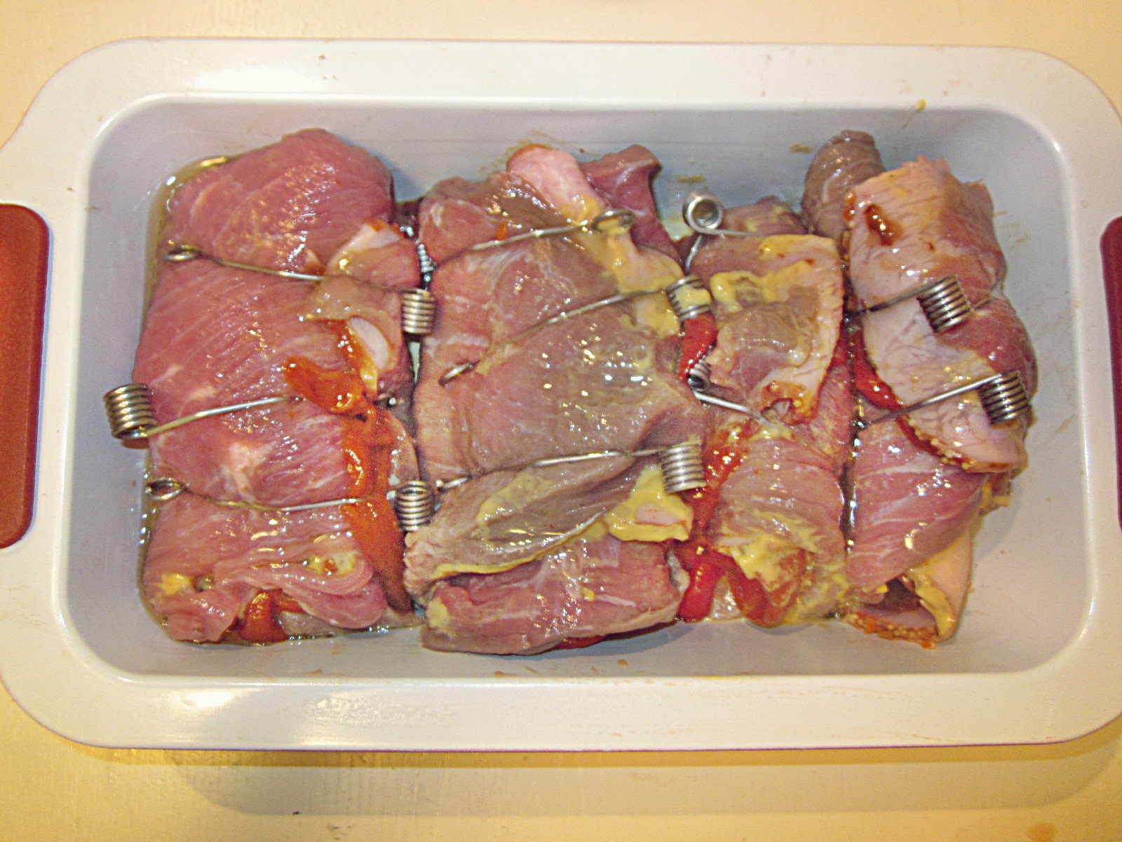 - Feliile de carne preparate, ca pentru snițel, adică feliate cât mai subțire, se asezonează de sare, piper, apoi se ung cu muștar. Se așează pe fiecare bucată de carne asezonată, câte două felii de sunculiță afumată și ardei copt din salată, apoi se rulează, se prind cu scobitori sau cleme speciale pentru rulade.