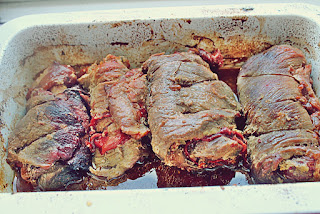 - Rulorile obținute se așează într-un vas termorezsitent, se stropesc cu puțin ulei de măsline, apoi se dau la cuptor ptr cca. 10 minute pe fiecare parte, apoi se toarnă vinul, se acoperă cu un capac, sau folie de aluminiu și se lasă la gătit cca. 90 de minute la foc mediu, 180 grade, electric.