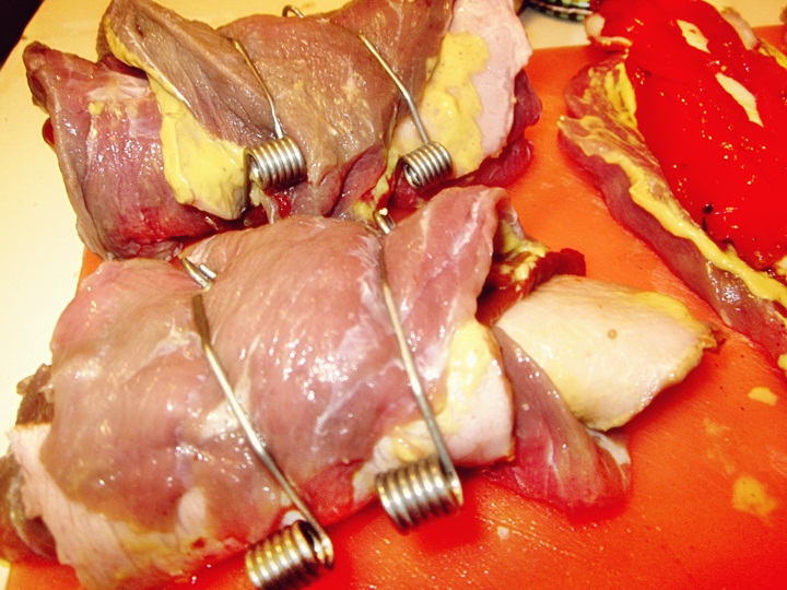 • Feliile de carne preparate, ca pentru snițel, adică feliate cât mai subțire, se asezonează de sare, piper, apoi se ung cu muștar. Se așează pe fiecare bucată de carne asezonată, câte două felii de sunculiță afumată și ardei copt din salată, apoi se rulează, se prind cu scobitori sau cleme speciale pentru rulade.