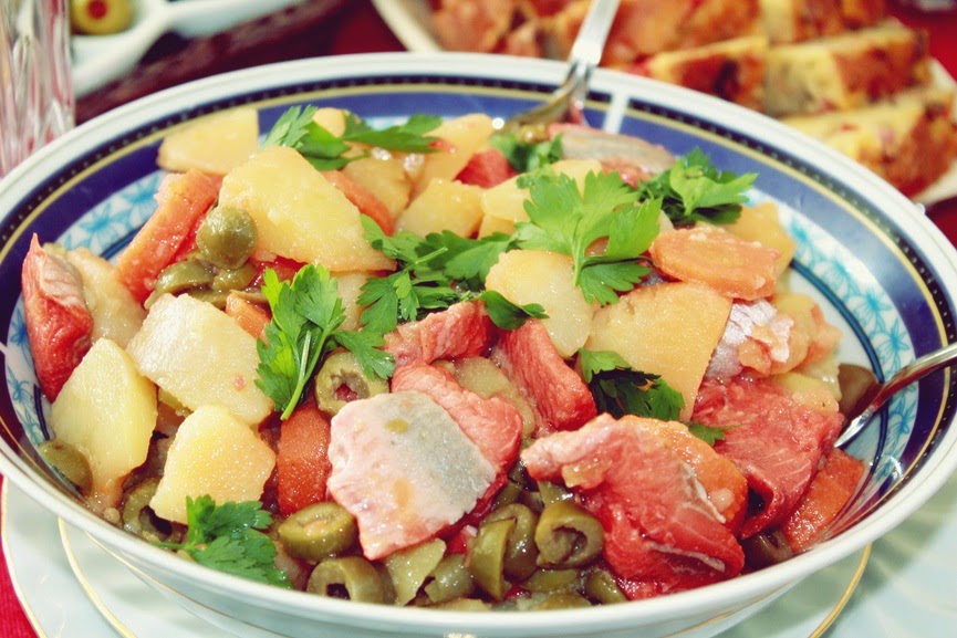 • După ce s-au fiert vegetalele, se curăță după caz, se taie rondele  într-un vas încăpător, unde se adaugă bucățelele de somon și măslinele feliate, amestecându-se ușor până ce se înglobează toate ingredientele.