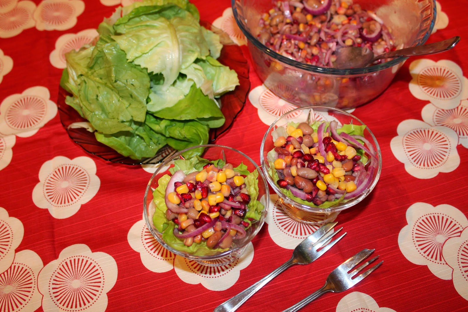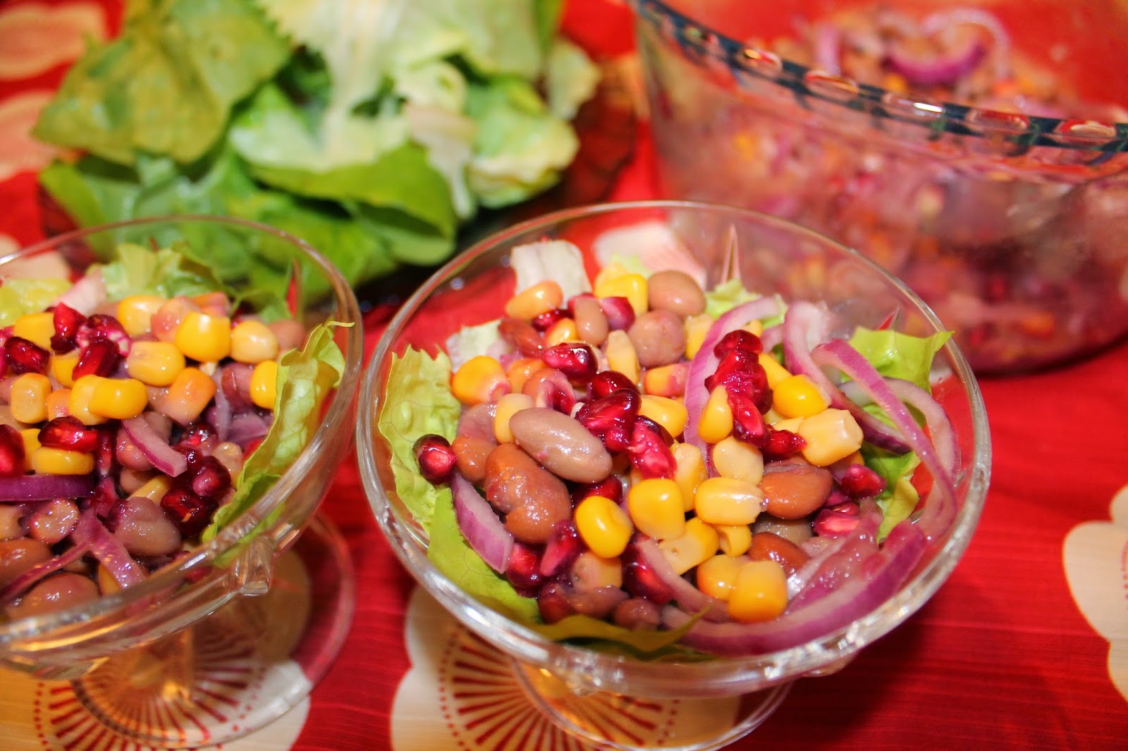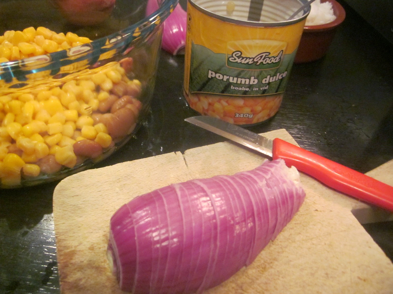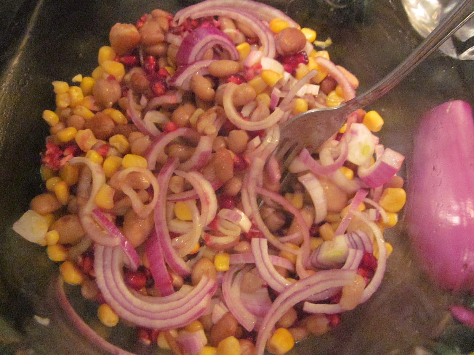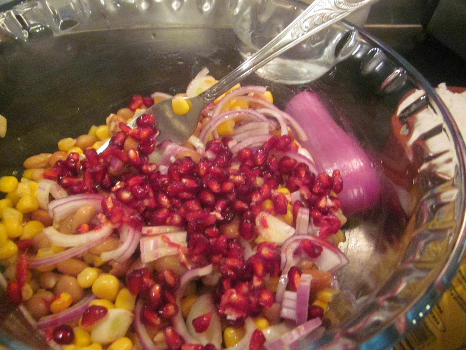 - Într-un vas mare punem boabele de porumb, boabele de fasole, toate scurse de zeamă ceapa tăiată julien și boabele de rodie.