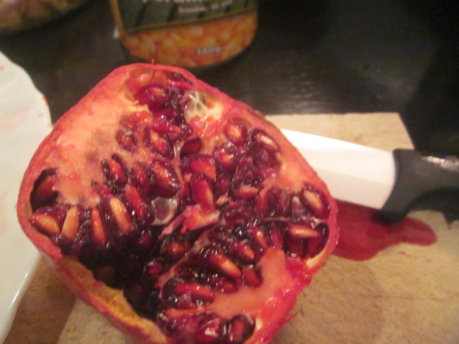 - Se amestecă ușor, se asezonează de sare, piper, uleiul de măsline, zeama de rodie și lămâie.