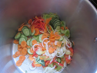 - Oțetul, zahărul și sarea se amestecă energic, adăugându-se peste amestecul de legume, se amestecă ușor și se lasă de seară până dimineață.
