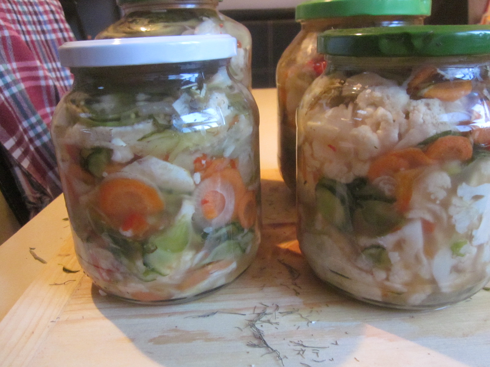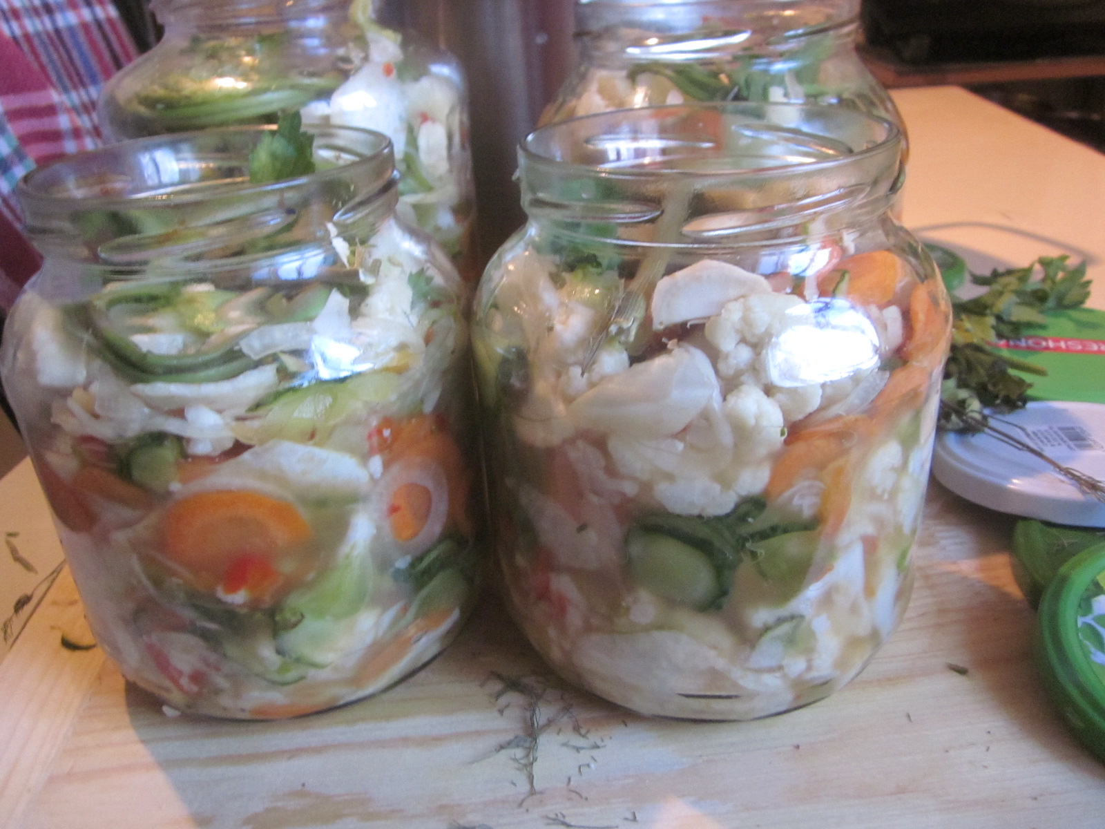 - A doua zi se așează amestecul de legume în borcane (curate, uscate și răcite) cu amestecul de legume. în fiecare borcan se pune 1 boabă enibahar, câteva semințe de muștar, boabe de piper, foaie de dafin, mărar uscat, tije de țelină și o bucată de hrean.