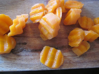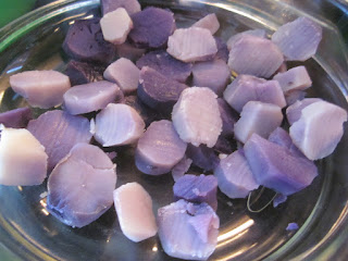 - Rădăcinoasele se fierb separat. Aici ar fi un fel de ”frână” în a prepara această salată delicioasă;) Dar cu răbdare veți obține rezultate bune. Cartofii albi se fierb în coajă, așa ar fi trebuit să procedez și cu cei violet, dar am vrut să văd cum arată fără coajă 😀 😉 Morcovul și sparanghelul, curățați se pot fierbe împreună.
