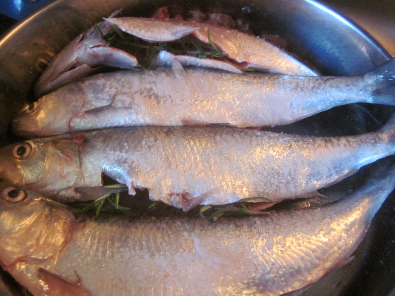 Peștele se curăță de solzi și intestine, se sărează pe interior și exterior, apoi se pune câte o crenguță de rozmarin în burta peștelui, și se lasă la rece, în frigider, acoperit într-un vas până a doua zi, sau minim 3 ore.