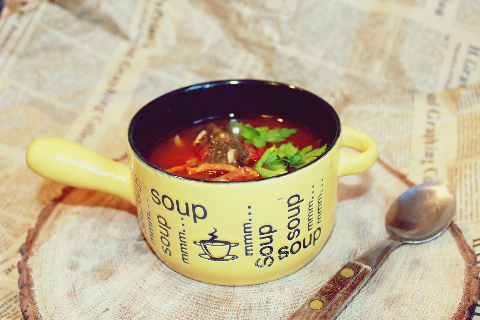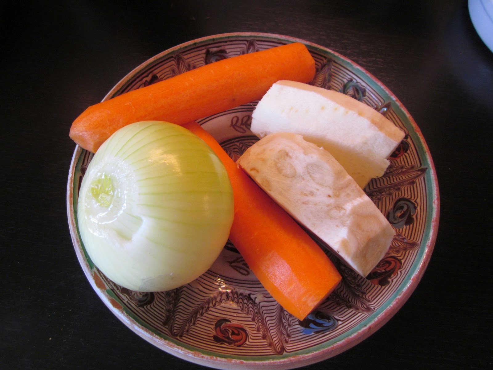 - Se spală și se curăță toate legumele, apoi se toacă foarte mărunt, m-am ajutat cu răzătoarea Moulinex. Ceapa se pune la călit in ulei și puțină apă, se adaugă rădăcinoasele tocate julien, ardeiul bucățele, roșiile din conservă tocate mărunt, se asezonează de sare, piper foaie de dafin, se completează cu apă și se lasă la fiert cca. 30 de minute la foc mic, neacoperit.