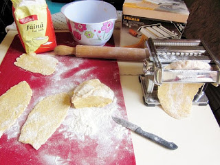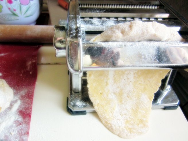 - Acum urmează partea cea mai simplă, nu-i nevoie să se întindă aluatul cu sucitorul, sau făcălețul :D, ci simplu se taie bucăți din aluat, se trec prin făină, ca să nu se lipească de tamburii mașinii. Se întinde pe prima mărime, se lasă la uscat un pic foaia, apoi se schimbă pasul, până se obține finețea dorită. După ce s-a terminat operațiunea întindere, se mută manivela la valțurile de tăiere. Se taie în funcție de modelul mașinii, tagliatelle sau fidea 😉
