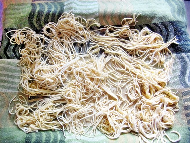 Tăițeii de casă sunt foarte buni, mai ales dacă îi face mama :)) Dacă nu ne-am mai văzut de mult, mi s-au terminat proviziile și a trebuit să prepar eu 😉 Am scos mașina de întins, tăiat tăiței de la ”naftalină” ( nu am mai folosit-o de vreo 18 ani 🙂 și am trecut la treabă. Sincer acum mi se pare tare simplu;) Spor și succes!