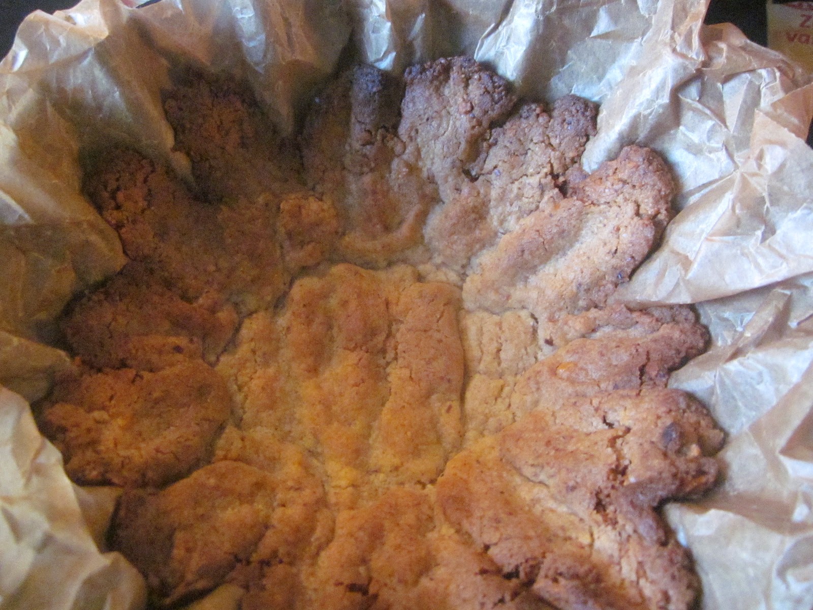 Se unge o formă de tartă, (cu diametrul 26 cm), cu puțin unt sau se tapetează cu foaie de pergament, se dă tarta la copt la 200 g în cuptorul electric sau la treapta 3 în cel cu gaz, cca. 12-15 minute, se scoate din cuptor după ce a trecut testul scobitorii și se lasă la răcit.