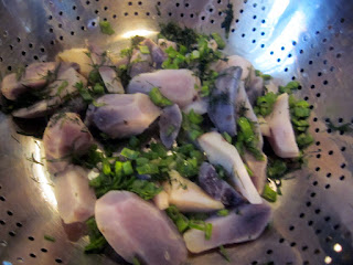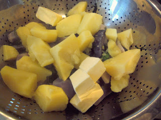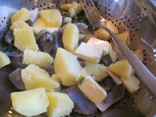 - Cartofii fierți se strecoră de apă, se pun într-un vas, se adaugă untul cubulețe, ceapa verde tocată mărunt, doar partea verde, se asezonează de sare și piper, apoi se amestecă ușor, ca să se înglobeze aromele.