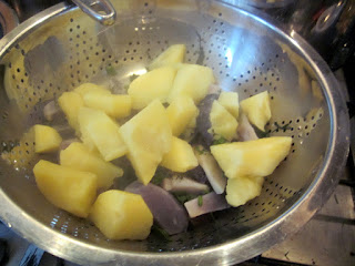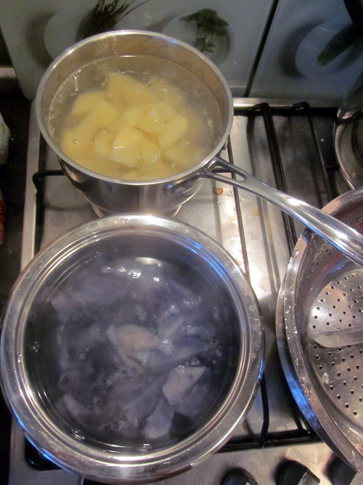 - Cartofii se curăță de coajă, apoi se taie în bucăți mari și se pun la fiert în apă clocotită, puțin sărată în vase diferite, cca. 15 minute, la foc mediu, până ce sunt pătrunși.