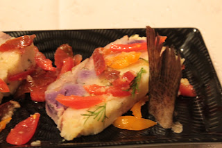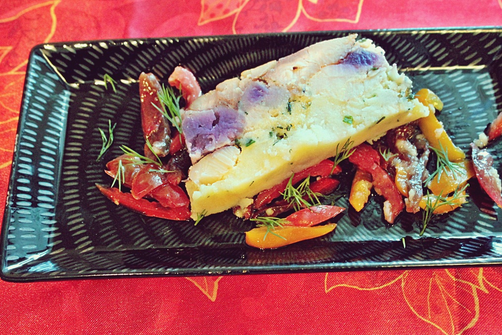 - Apoi se așează fileurile de păstrăv și se acoperă cu restul de cartofi. Atenție, terina nu conține niciun fel de gelatină, sau alt ingredient pentru a se lega, doar unt.